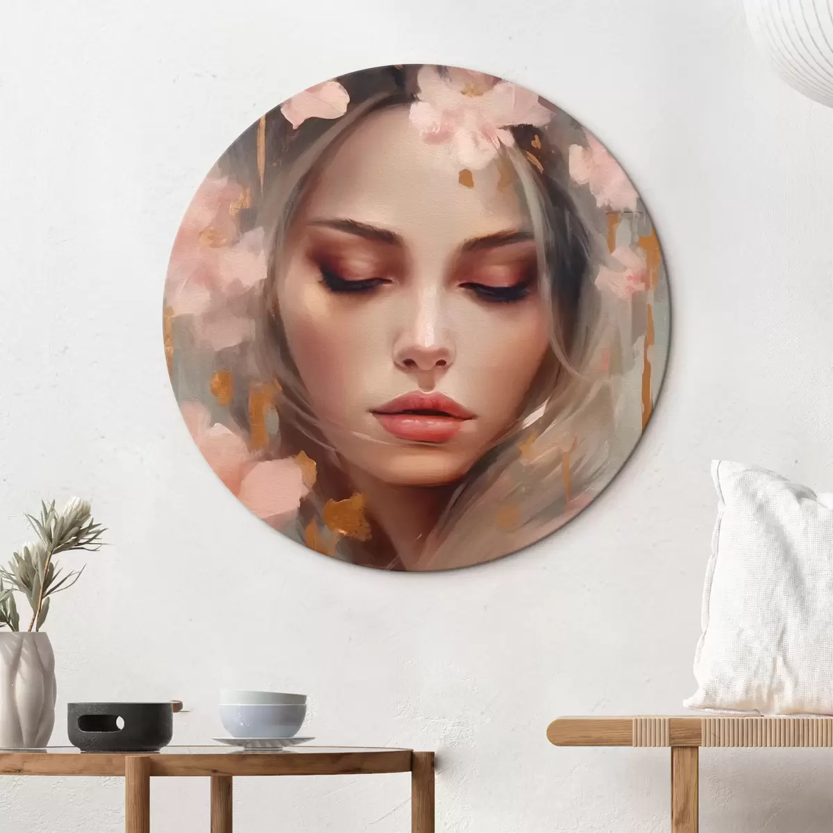 Ronde schilderijen Mooi meisje en bloemen Nr r42299