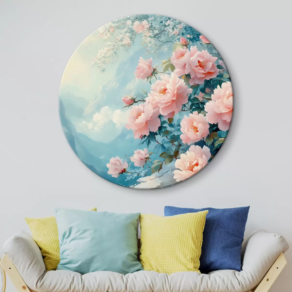 Ronde schilderijen Blauwe bergen en bloemen op de voorgrond Nr r42324