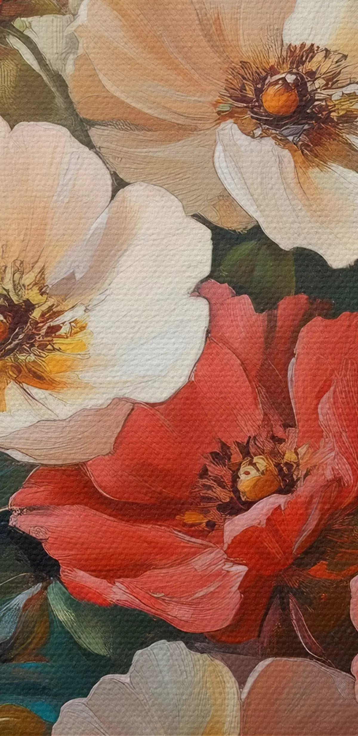 Er zijn drie soorten materiaal te bestellen: Economic Canvas - een dicht en duurzaam materiaal voor digitaal printen, identiek aan schildersdoek, waterdicht oppervlak, realistische weergave van details, materiaal met gemiddelde korrel. Premium Canvas - de textuur lijkt op die van schildersdoek (verweven kleine draden). Zachte, gedetailleerde reproductie van de afbeelding op een mat oppervlak. Eco-Premium - hoogwaardige 100% katoenen stof. Dankzij de natuurlijke katoenvezels is het materiaal duurzaam en slijtvast. Uitstekende kleurweergave en detail.