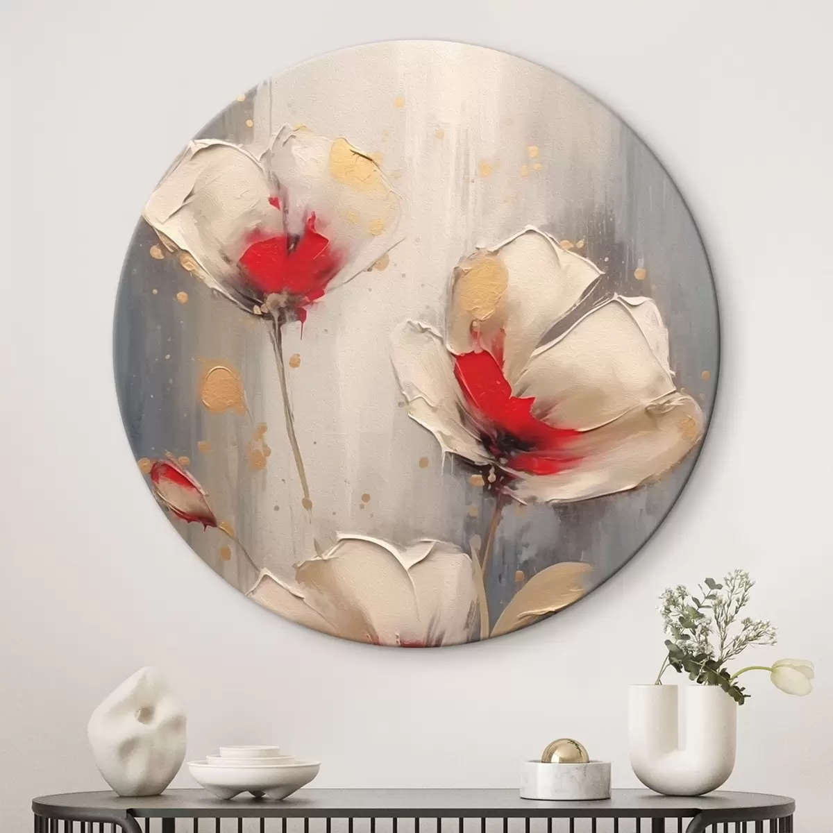 Ronde schilderijen Witte en rode bloemen Nr r42345