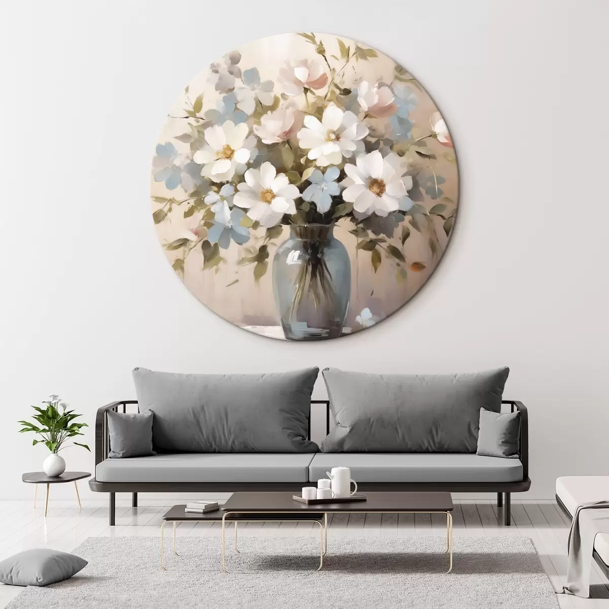 Ronde schilderijen Boeket bloemen en takjes in een vaas imitatie van schilderij r42356
