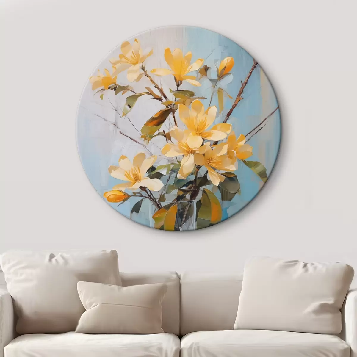Ronde schilderijen Takken met gele bloemen in een vaas imitatie van schilderij Nr r42358