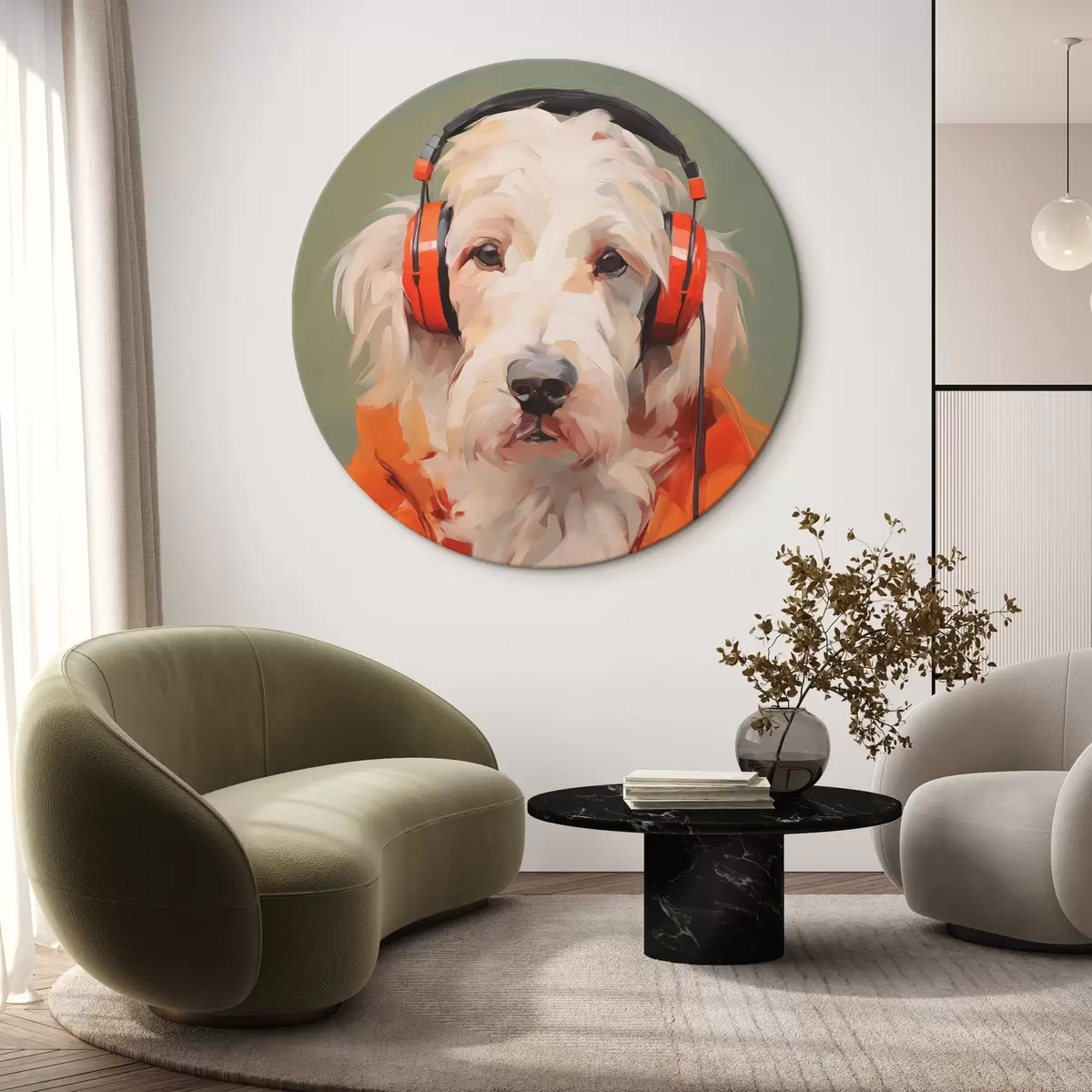 Ronde schilderijen Witte hond met oranje jas en koptelefoon imitatieschilderij Nr r42364