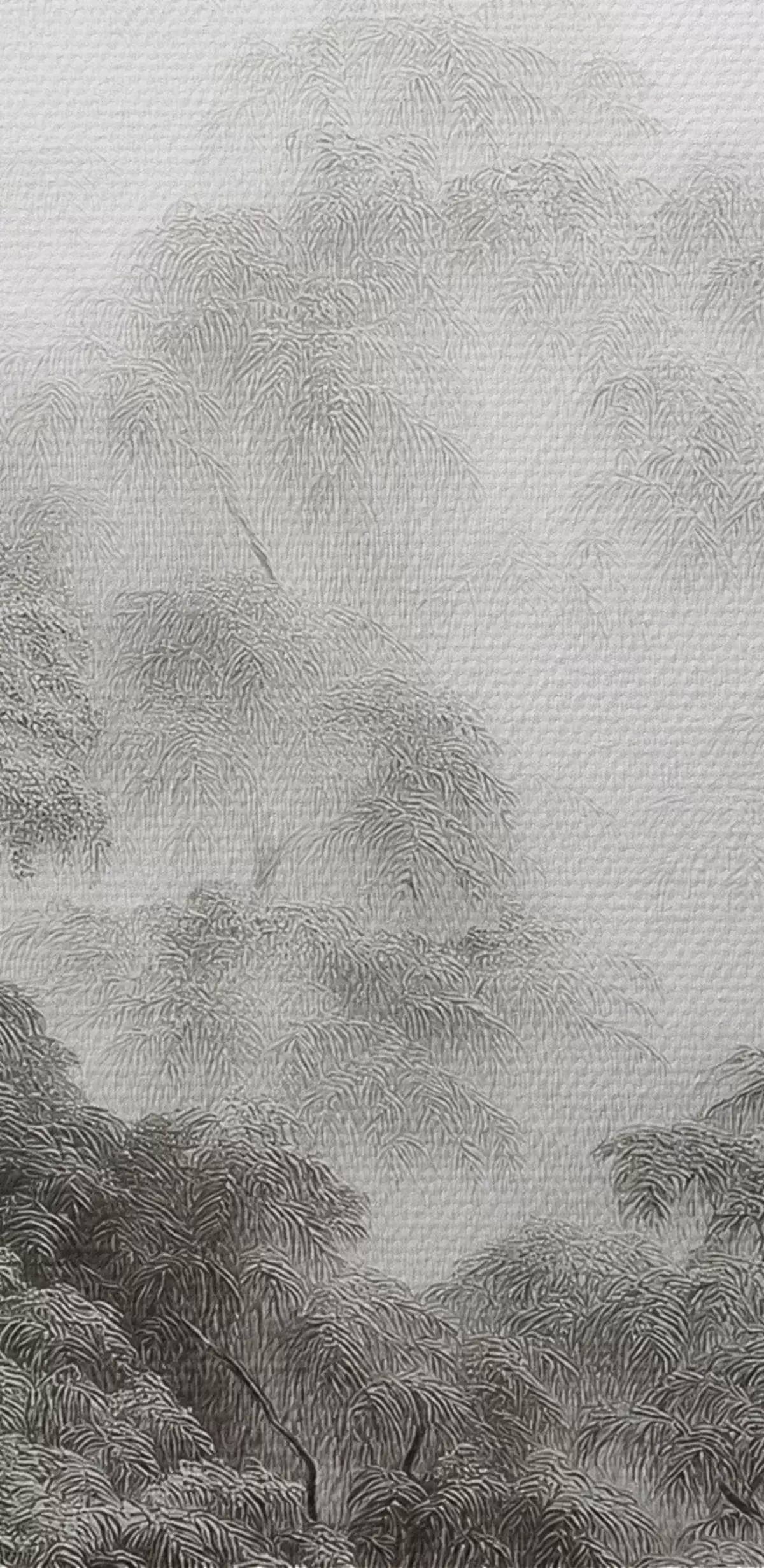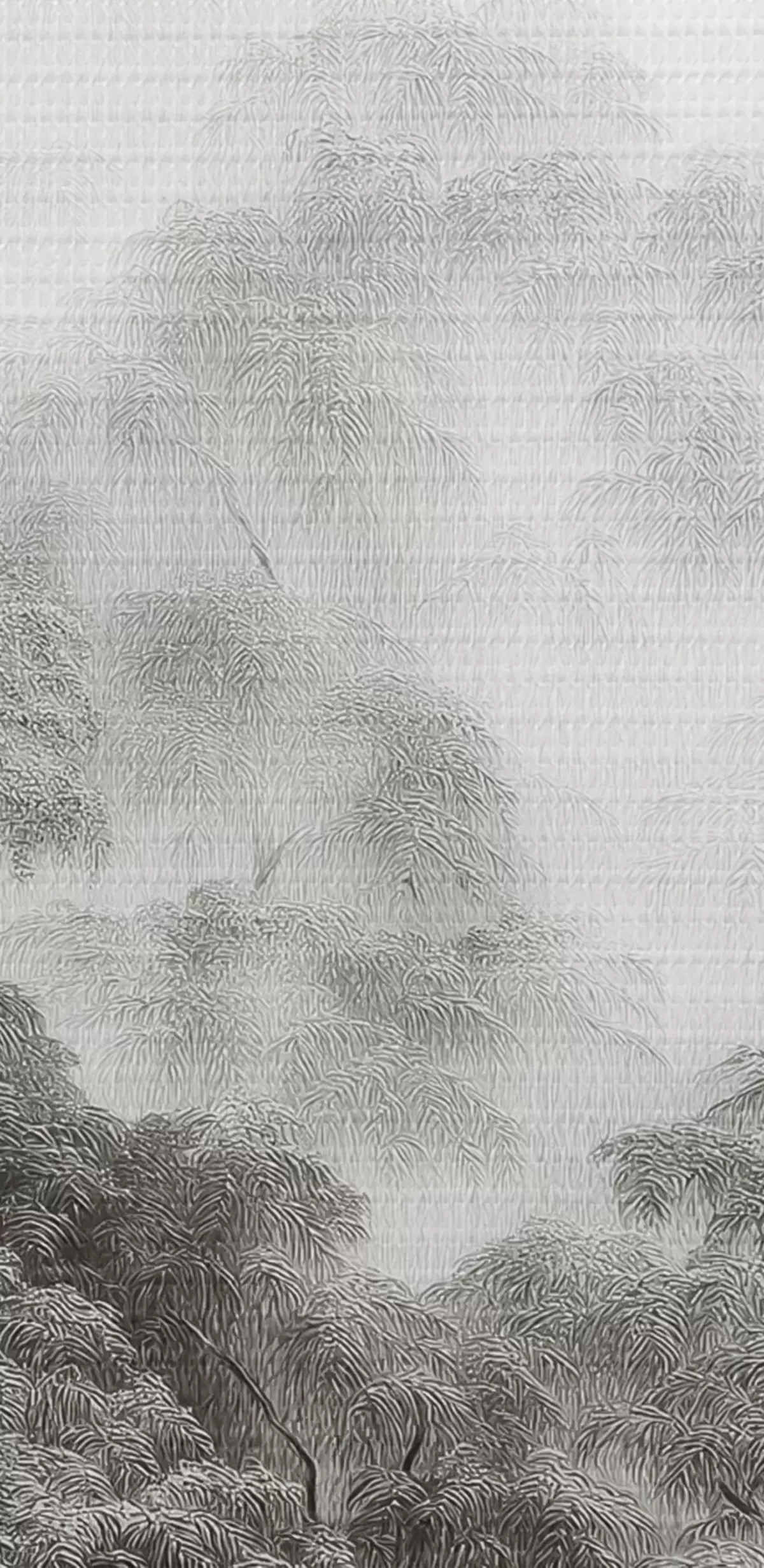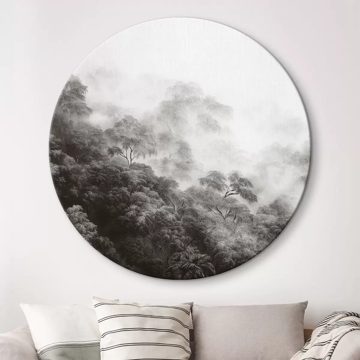 Ronde schilderijen Tropisch bos in de mist, palmbomen, grijze kleuren Nr r42371v1