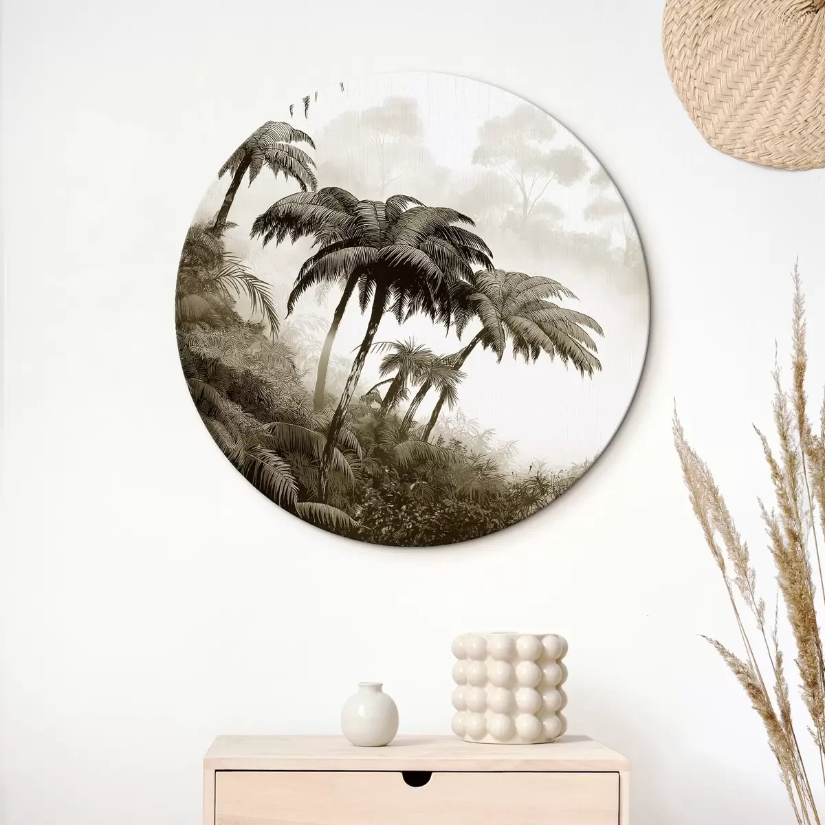 Ronde schilderijen Junglebos in de mist, palmbomen, natuur, beige kleuren Nr r42372