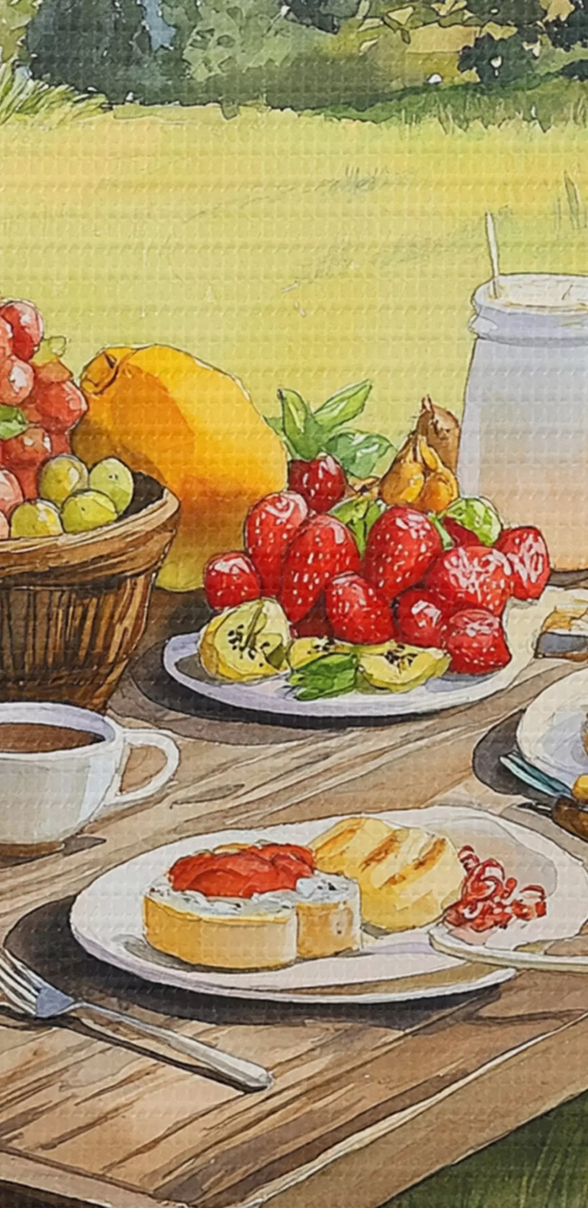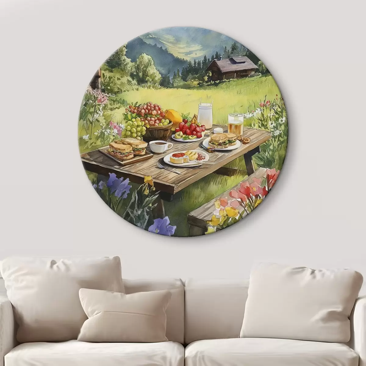Ronde schilderijen Berglandschappen, zomerweide, houten huizen, ontbijt r42425