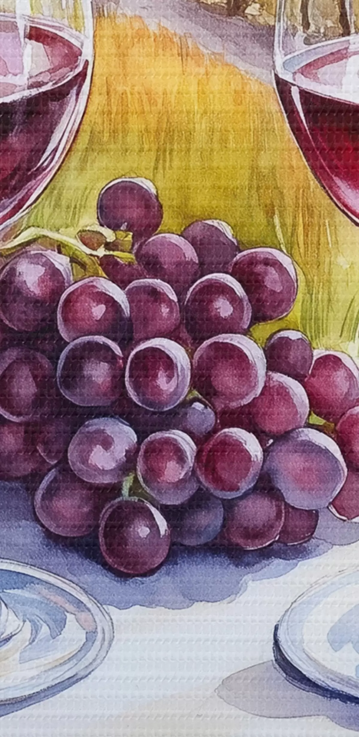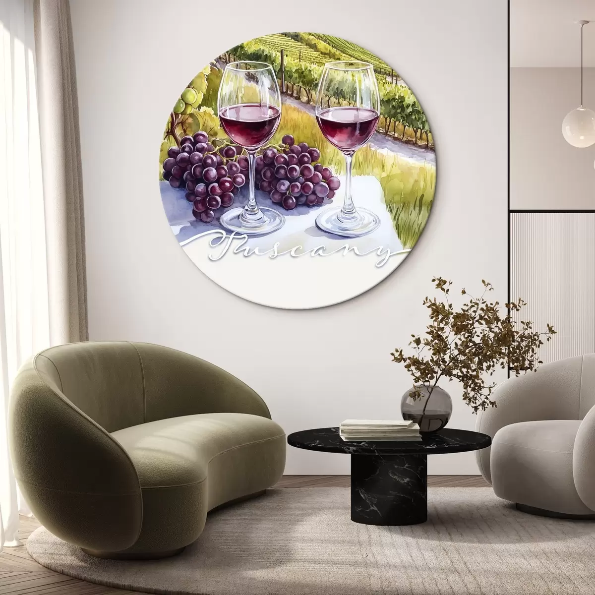 Ronde schilderijen Tuscany landschappen, aquarel stijl, wijnglazen, druiven, zonsondergang Nr r42439
