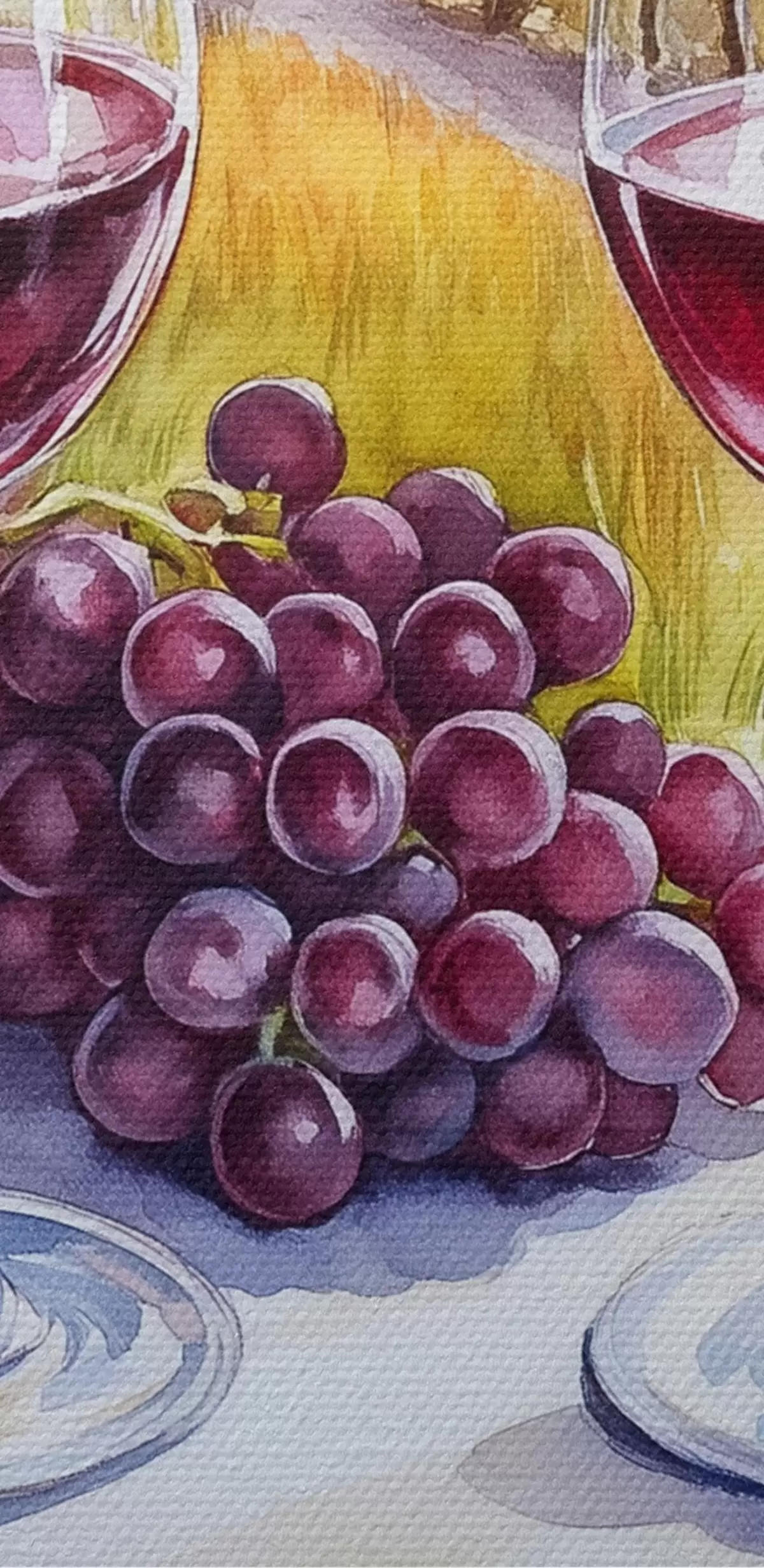 Ronde schilderijen Tuscany landschappen, aquarel stijl, wijnglazen, druiven, zonsondergang r42439
