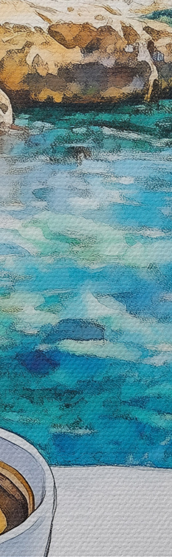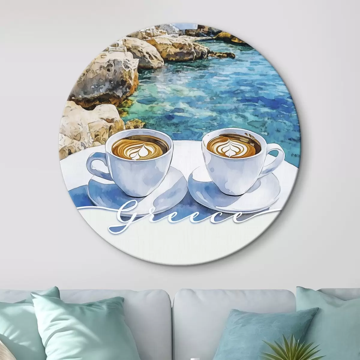 Ronde schilderijen Griekenland esthetiek, kopjes koffie, blauwe zee, oude stad, reizen r42447