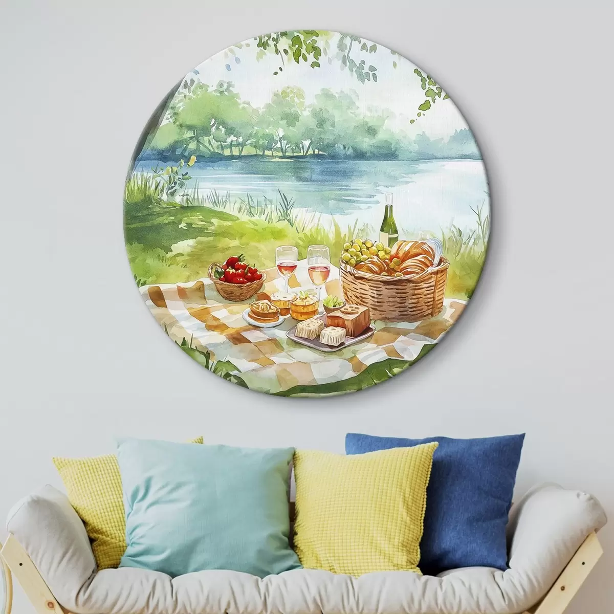 Ronde schilderijen Picknick esthetiek, zomer natuur, meer, romantisch, aquarel stijl r42450