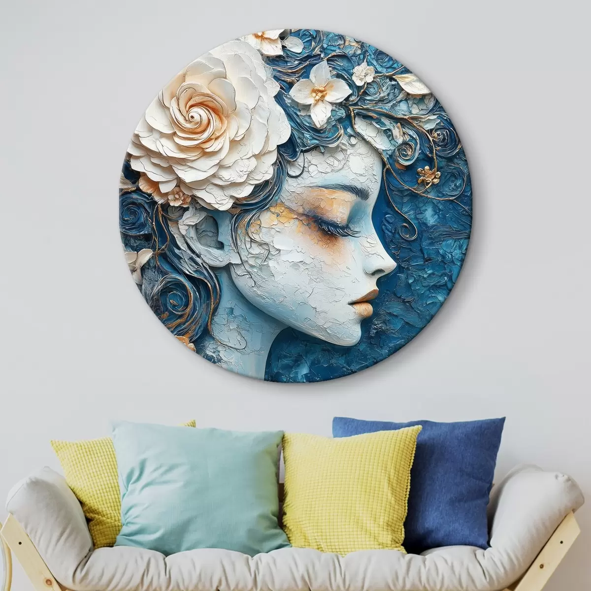 Ronde schilderijen Tekening van een meisje in profiel in blauwe tinten Nr r42495