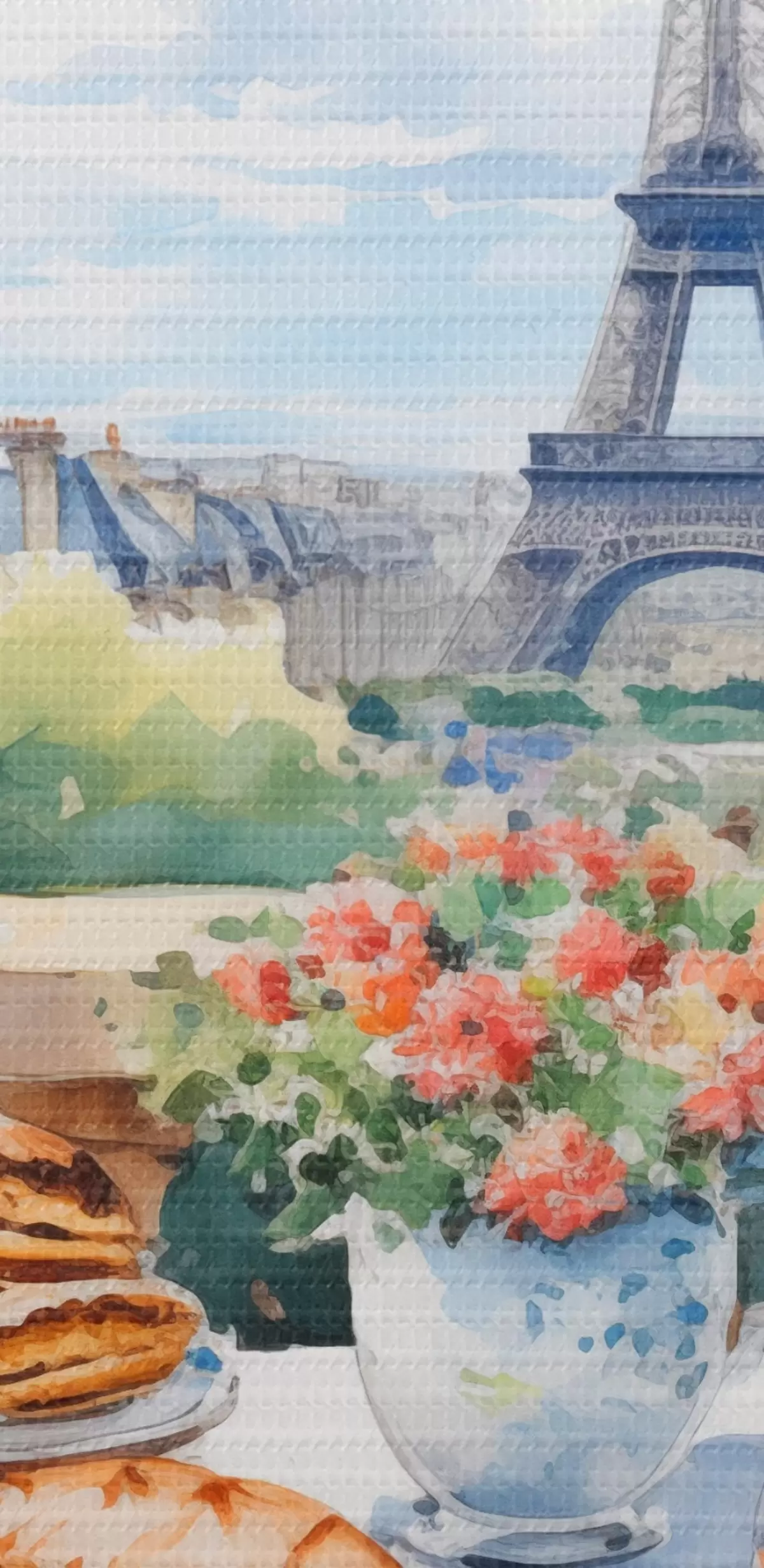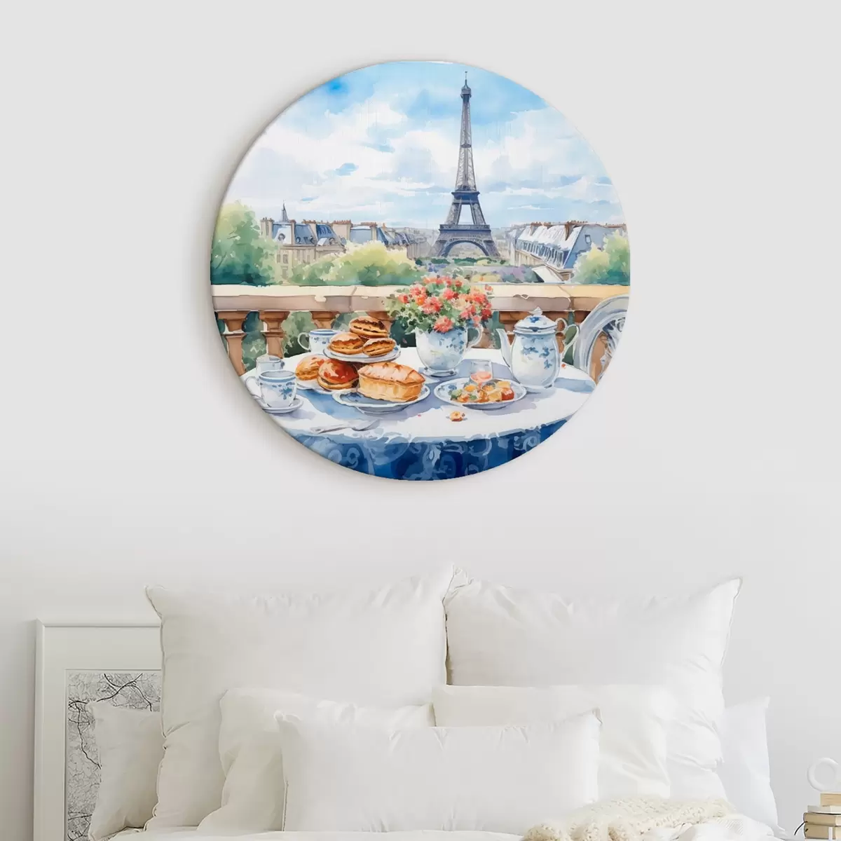 Ronde schilderijen Een romantisch uitzicht op de Eiffeltoren vanaf een balkon met een gedekte tafel met desserts, thee en bloemen in een zomerse sfeer Nr r42579