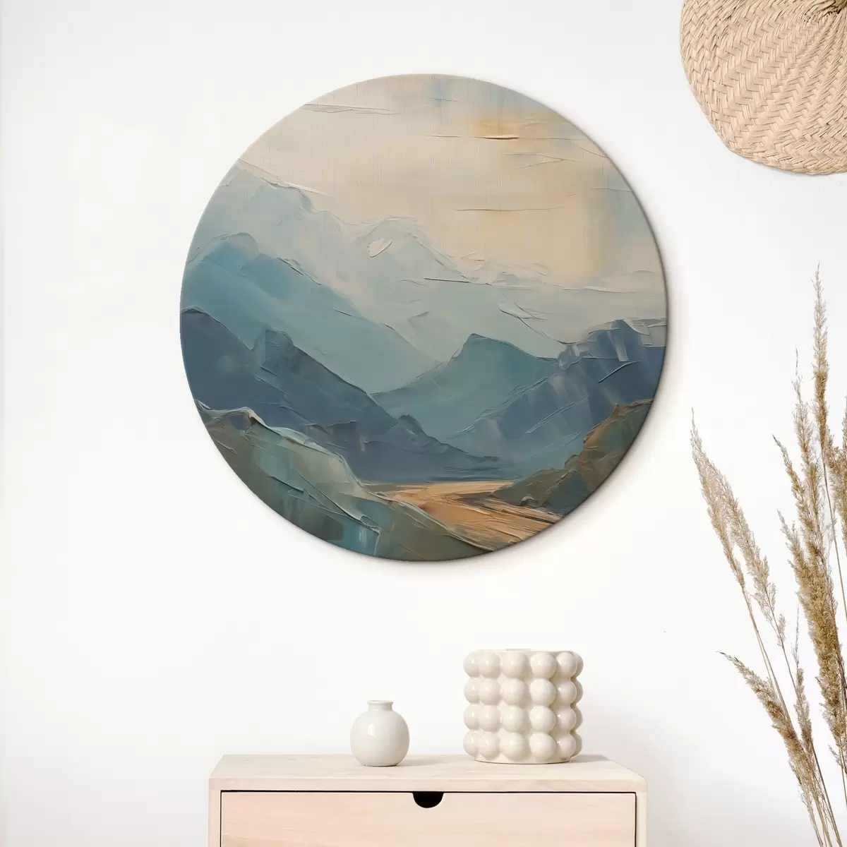 Ronde schilderijen Bergen abstractie imitatie penseelstreken r42592