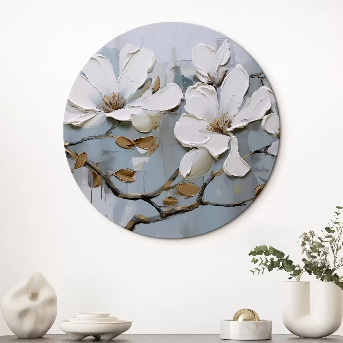 Ronde schilderijen Witte magnolia bloemen met getextureerde bloemblaadjes en bruine bladeren op een zachtblauwe achtergrond olieverfschilderij imitatie r42711