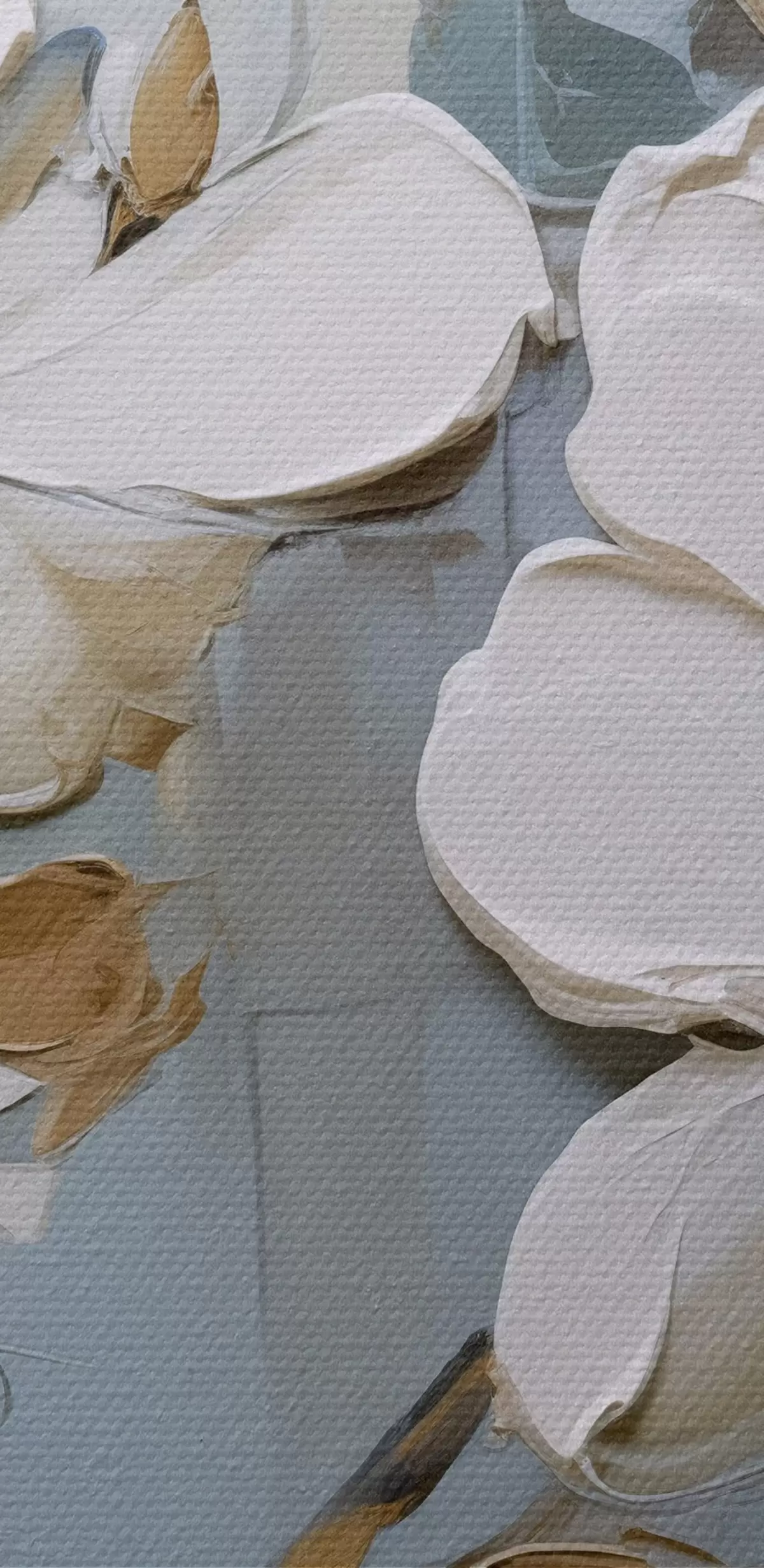 Ronde schilderijen Witte magnolia bloemen met getextureerde bloemblaadjes en bruine bladeren op een zachtblauwe achtergrond olieverfschilderij imitatie Nr r42711