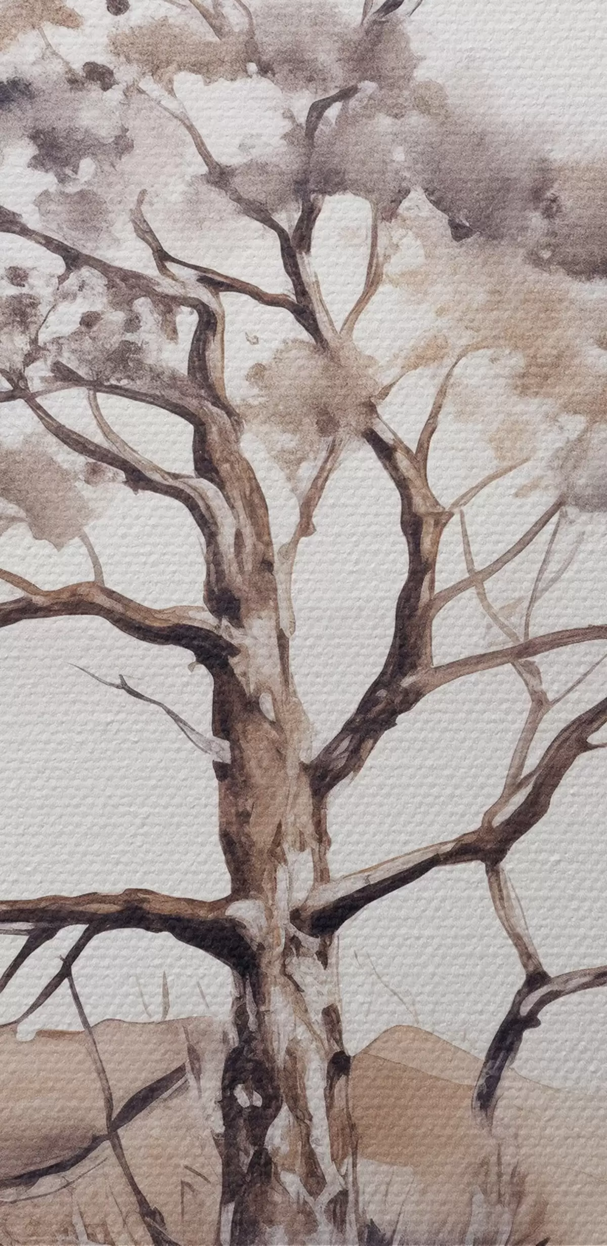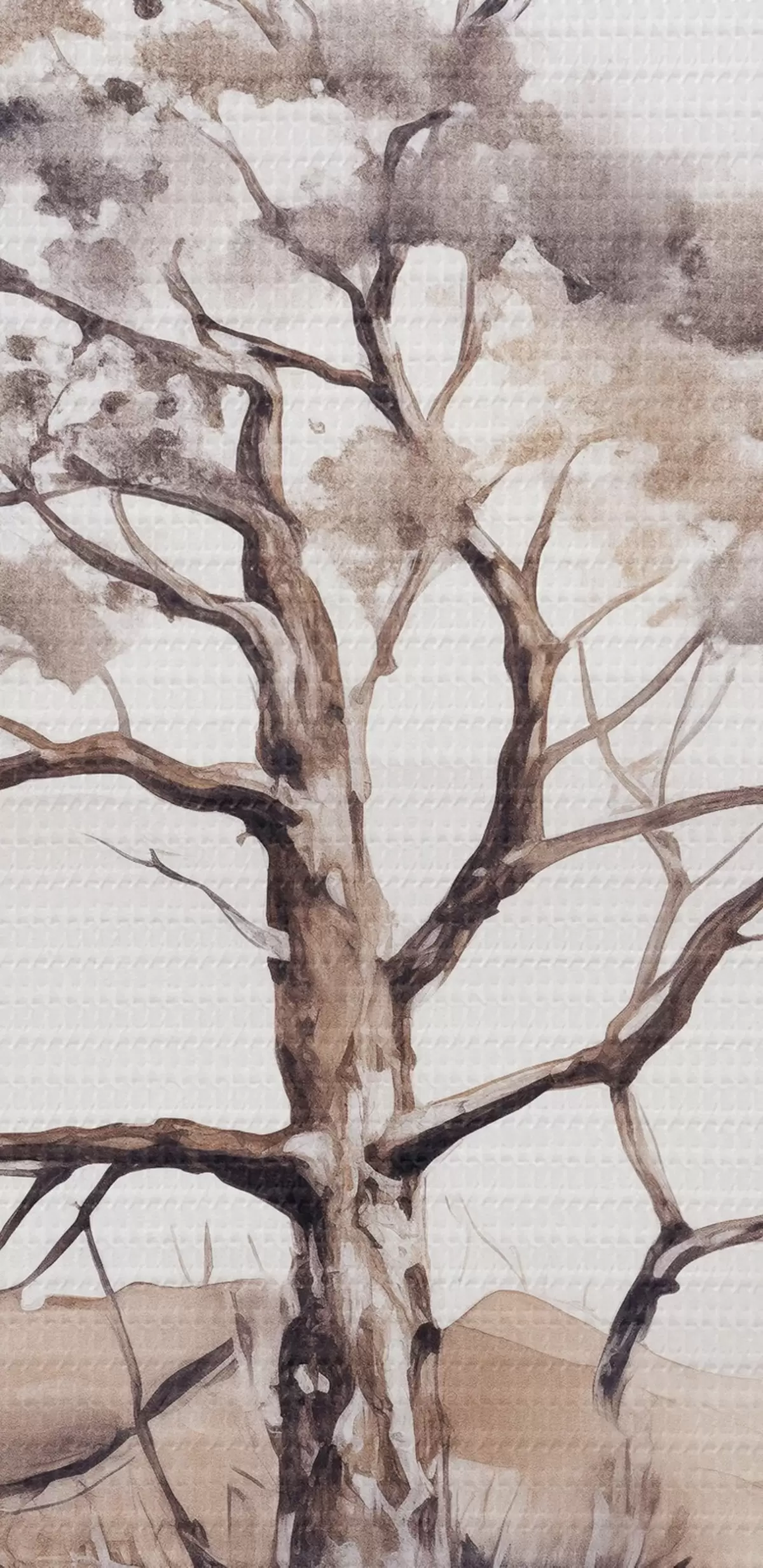 Ronde schilderijen Een eenzame boom met een gedraaide stam en spaarzame takken tegen een zachte, gedempte achtergrond van bergen Nr r42715