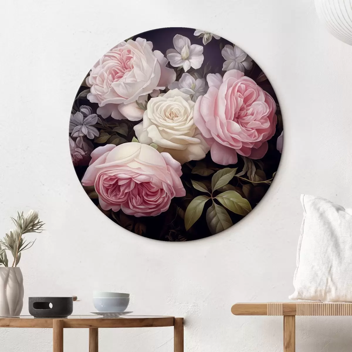 Ronde schilderijen Roze en witte rozen gerangschikt met delicate witte bloemen en groene bladeren tegen een donkere achtergrond Nr r42721