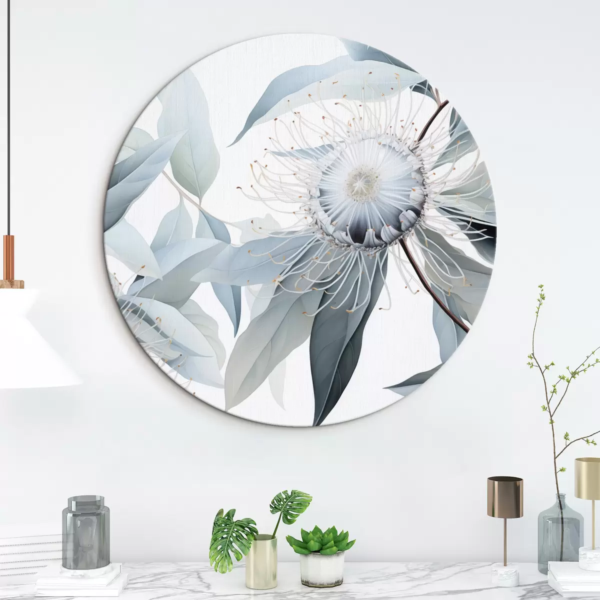 Ronde schilderijen Gedetailleerde botanische illustratie van eucaliptusbloemen met witte filamenten, omringd door zachte, lichtgroene bladeren Nr r42725