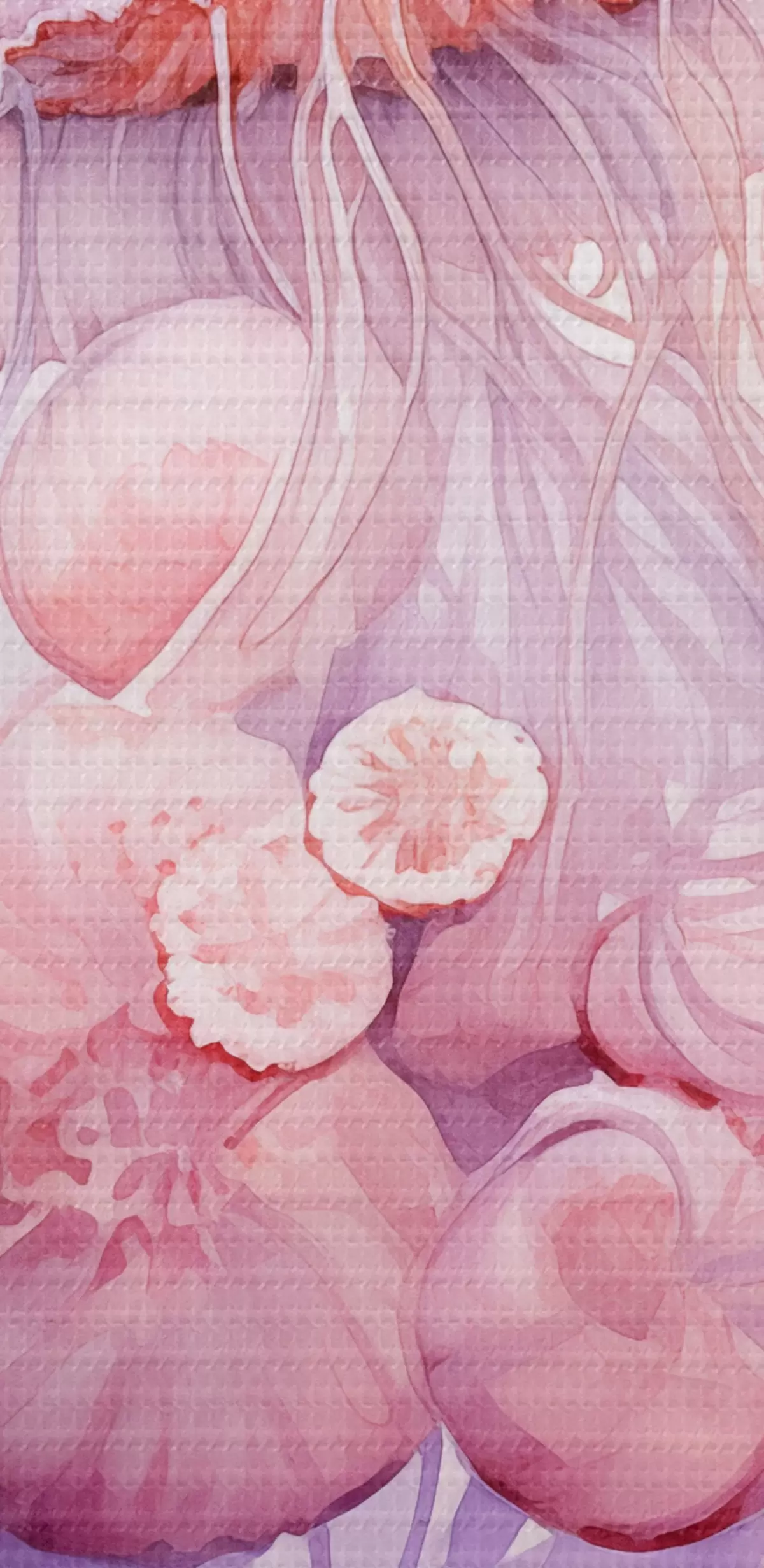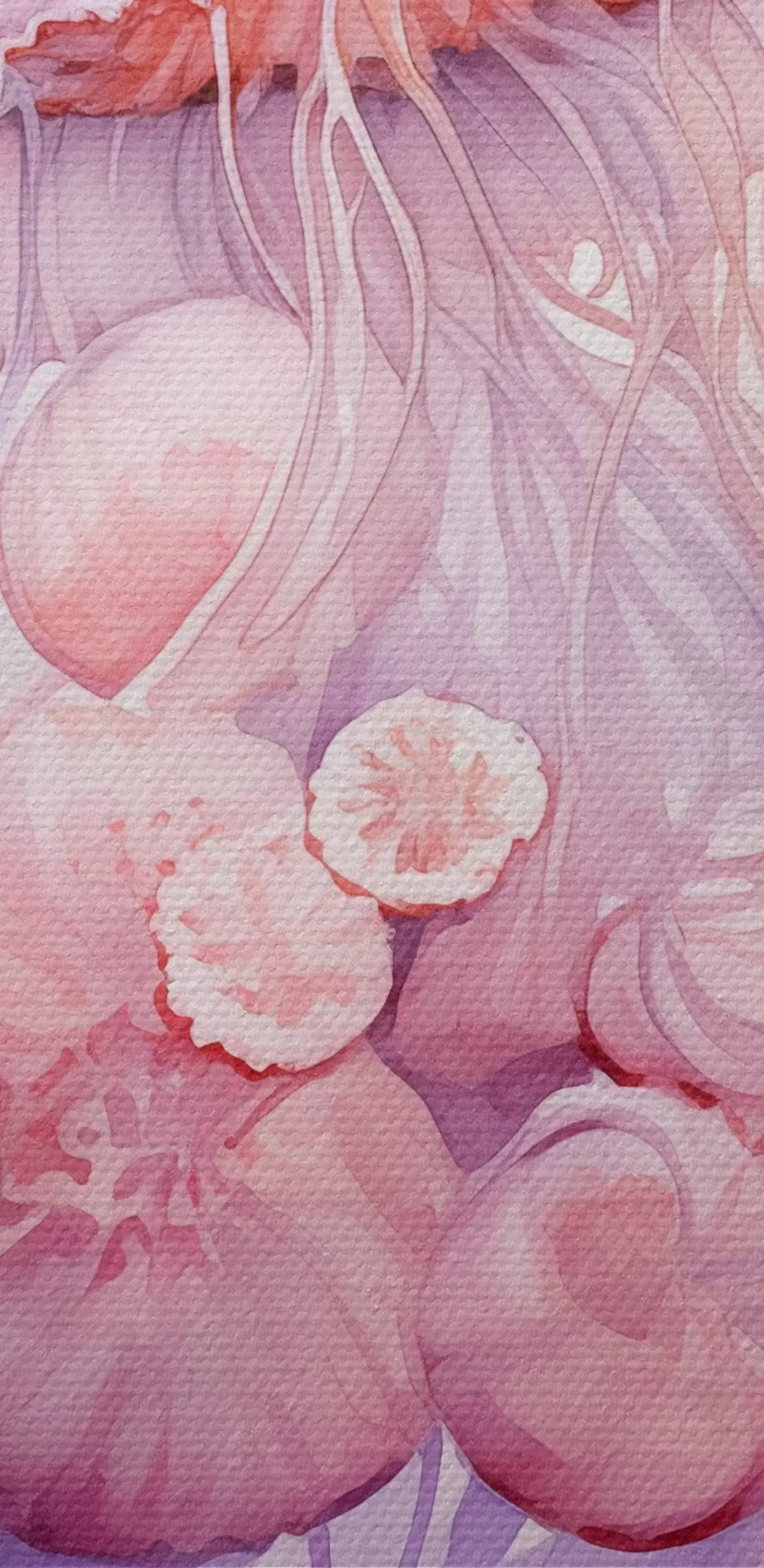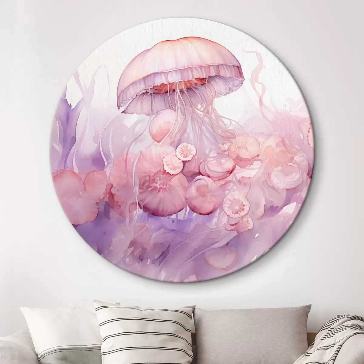 Ronde schilderijen Roze kwallen drijvend in een werveling van zachtroze en paarse tinten, omringd door abstracte vormen Nr r42730