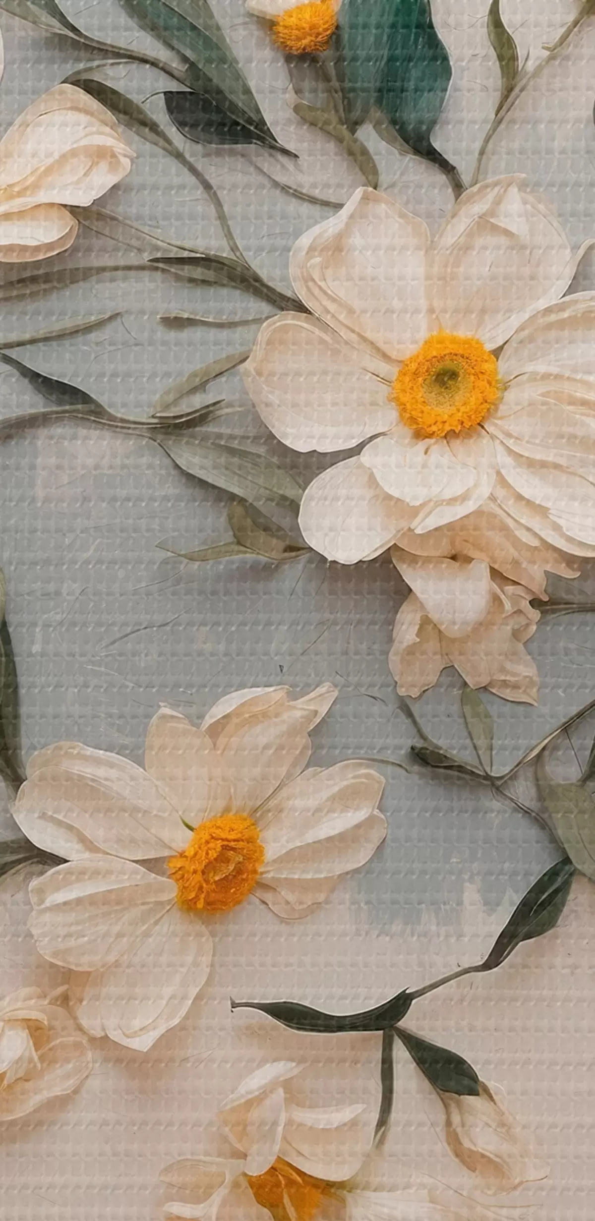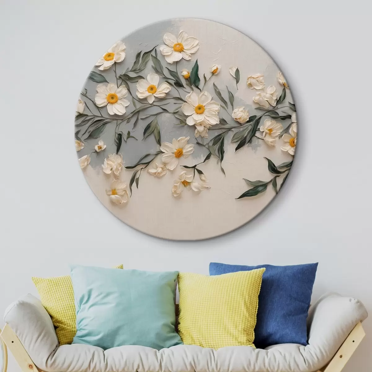 Ronde schilderijen Witte bloemen en bladeren op witte en grijze achtergrond Nr r42764