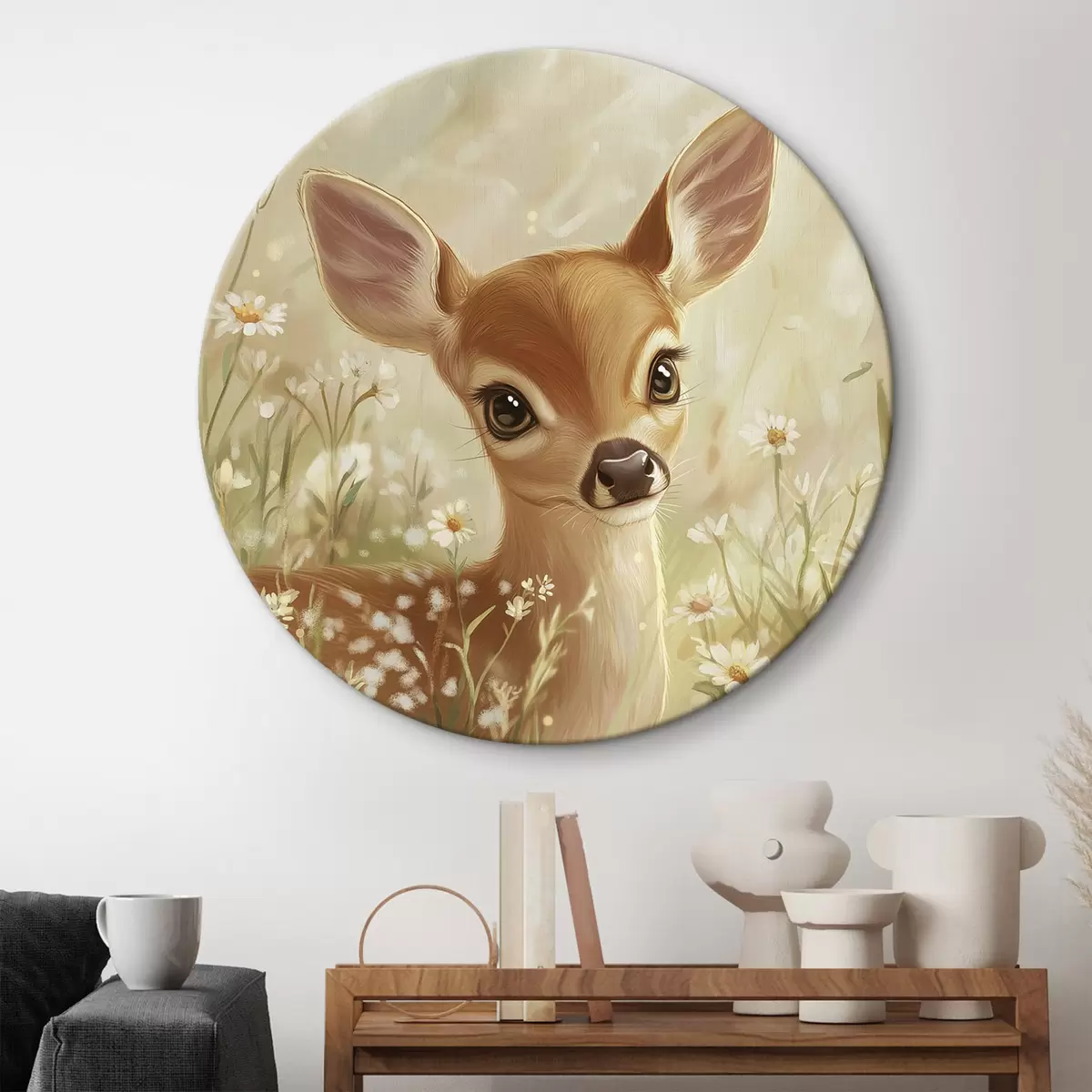 Ronde schilderijen Schattig hertje in de wei met madeliefjesbloemen, olieverf tekening r42780