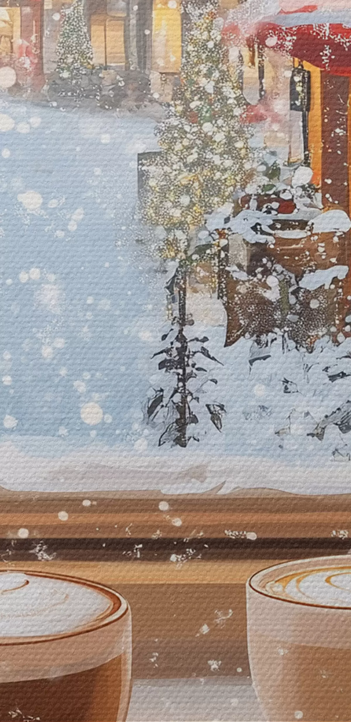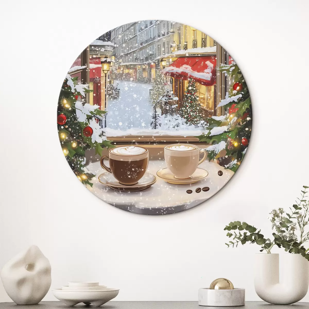 Ronde schilderijen Gezellig wintercafé, kopjes koffie, acrylstijl, oude stadsarchitectuur r42795