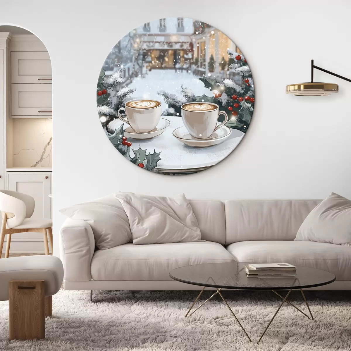 Ronde schilderijen Kopjes koffie in het gezellige café, winterse esthetiek, boho-stijl r42797