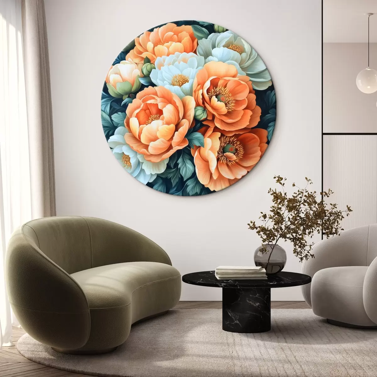 Ronde schilderijen Witte en oranje bloemen Nr r42860