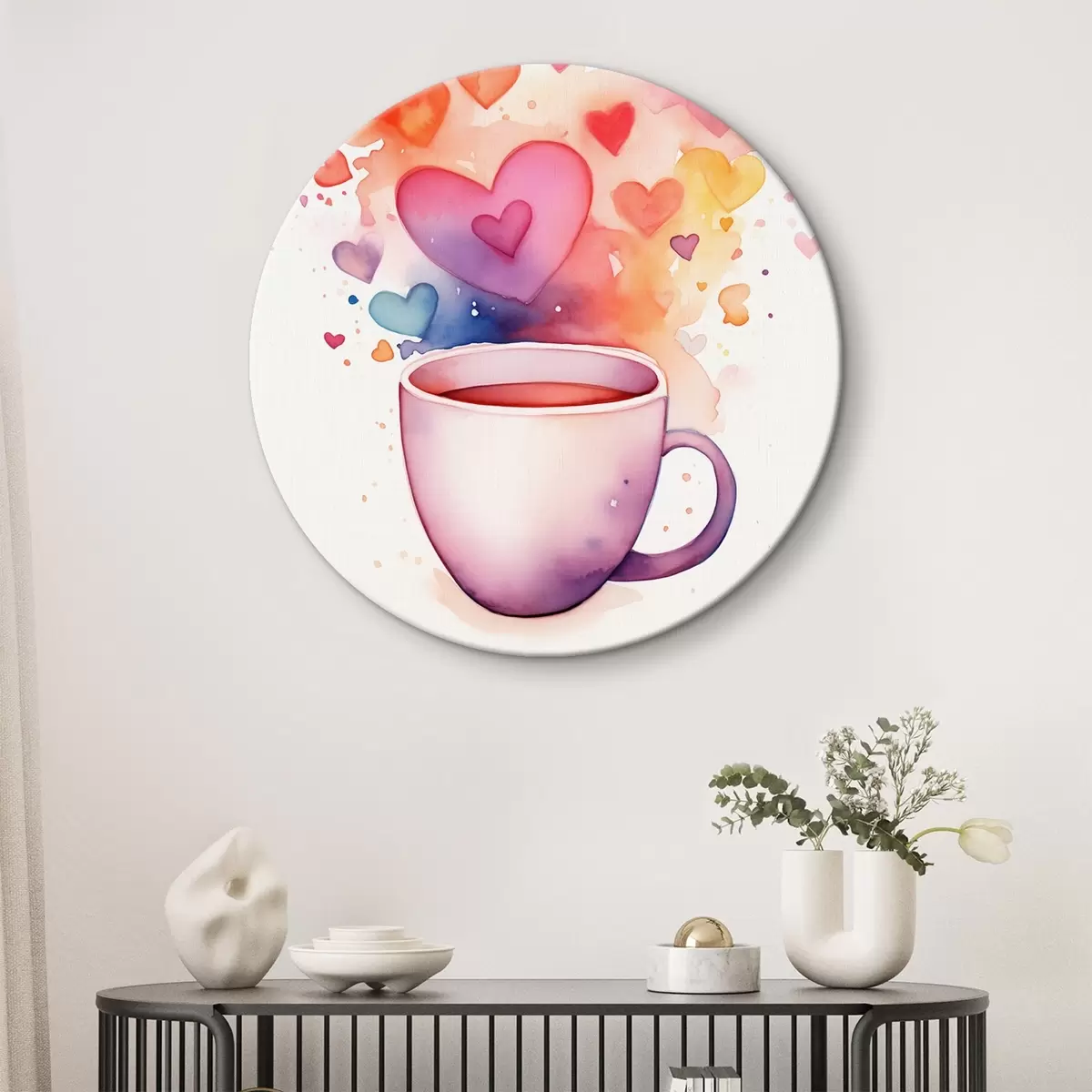 Ronde schilderijen Een kopje op een achtergrond van aquarel harten Nr r42869