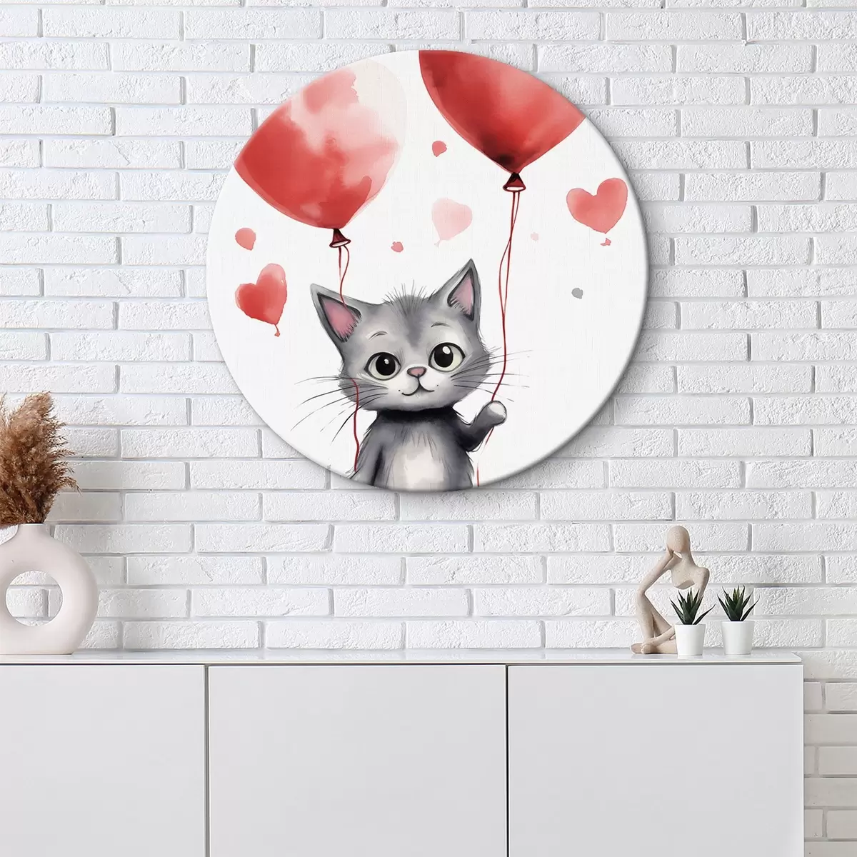 Ronde schilderijen Schattig katje met ballonnen in de vorm van hartjes Nr r42871