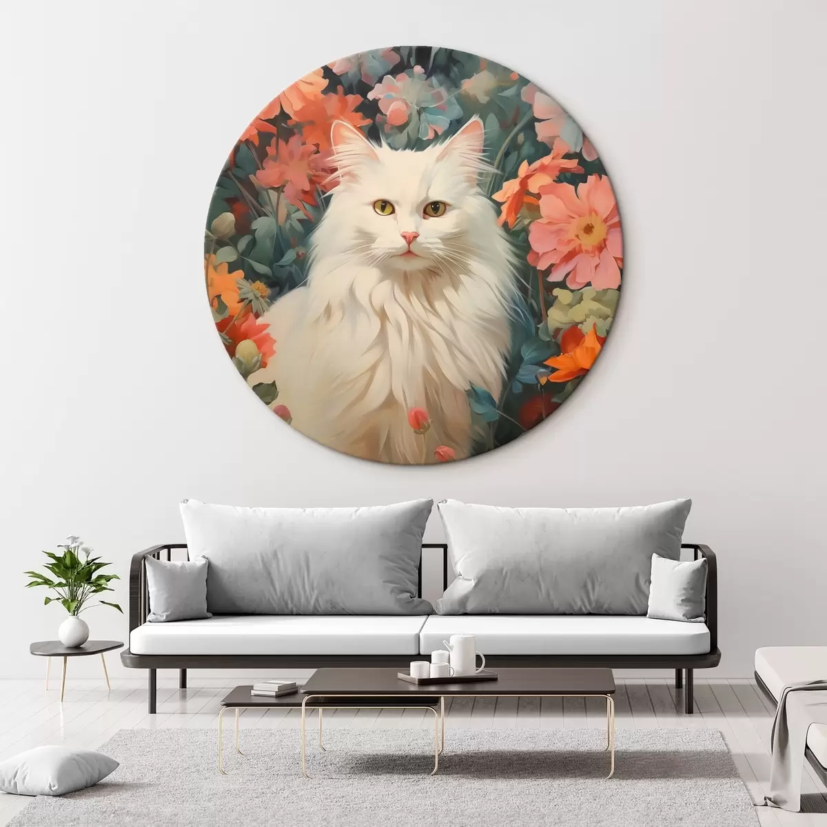 Ronde schilderijen Witte kat in bloemen Nr r42905
