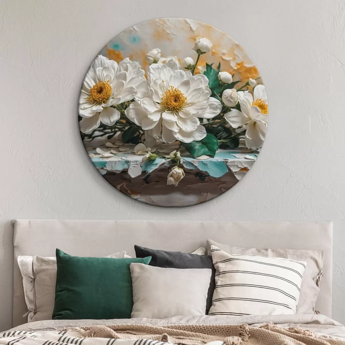 Ronde schilderijen Witte bloemen op een tafel op abstracte achtergrond Nr r42924