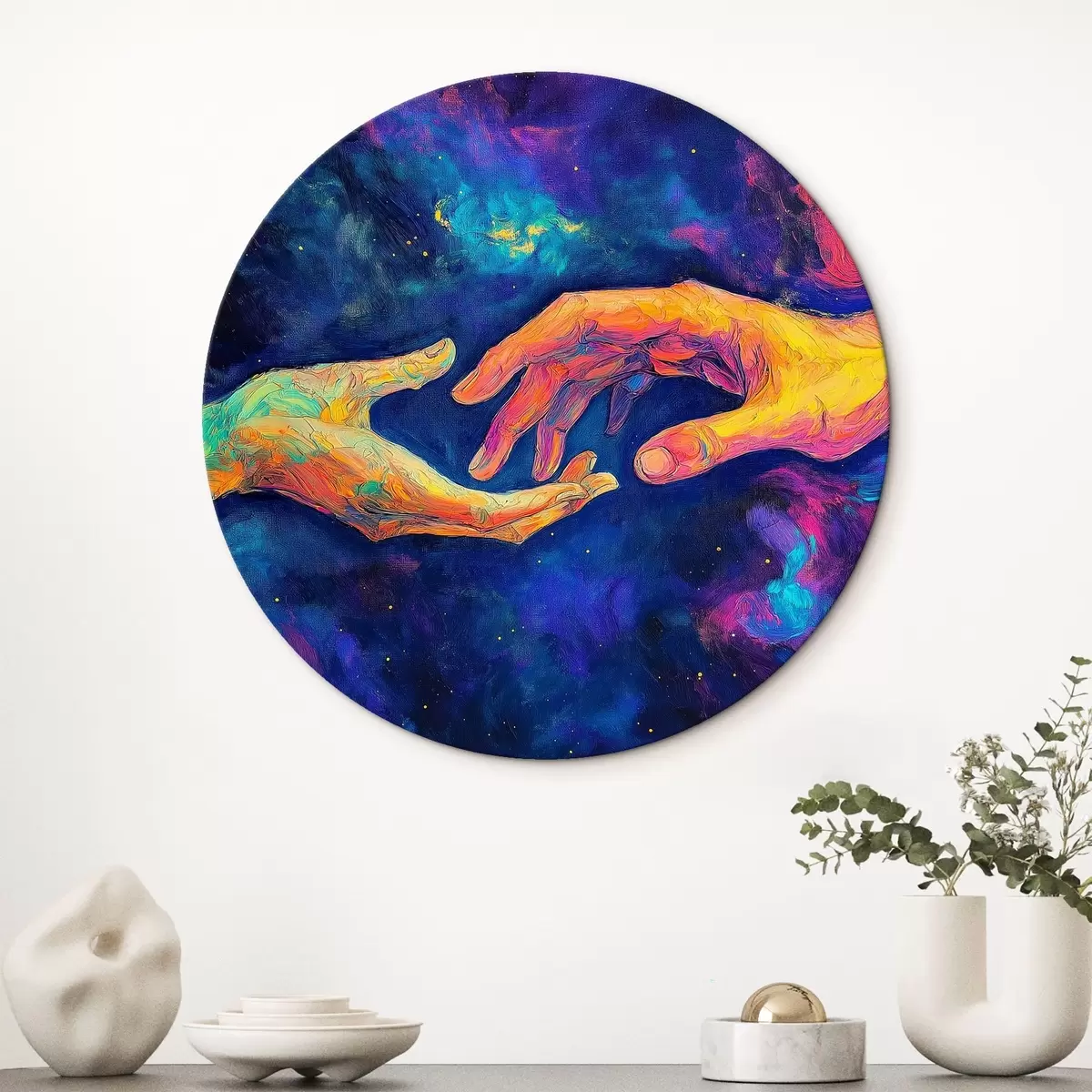 Ronde schilderijen Abstracte compositie van twee handen die naar elkaar reiken, in een levendig kleurenpalet op een kosmische achtergrond r42937