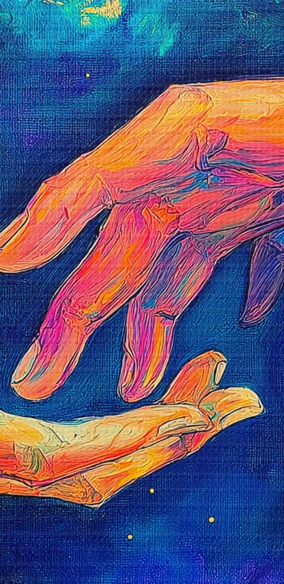 Ronde schilderijen Abstracte compositie van twee handen die naar elkaar reiken, in een levendig kleurenpalet op een kosmische achtergrond Nr r42937