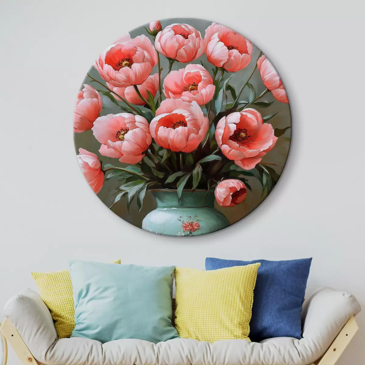 Ronde schilderijen Weelderige roze bloemen in een vaas Nr r42979