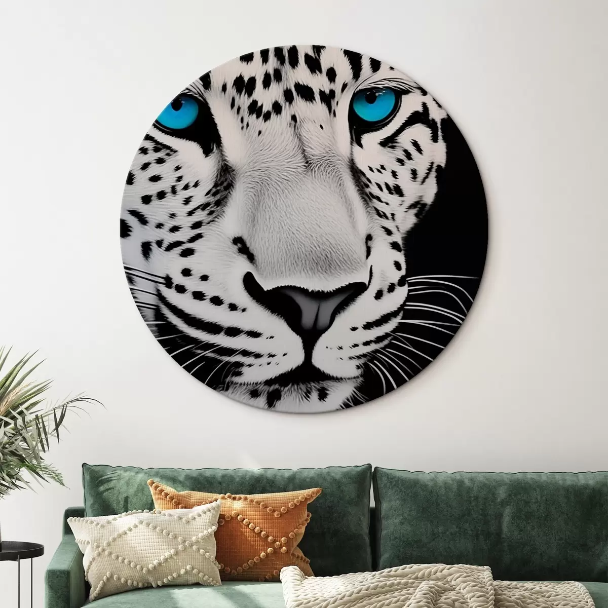 Ronde schilderijen Zwart-wit portret van een luipaard met blauwe ogen Nr r43008