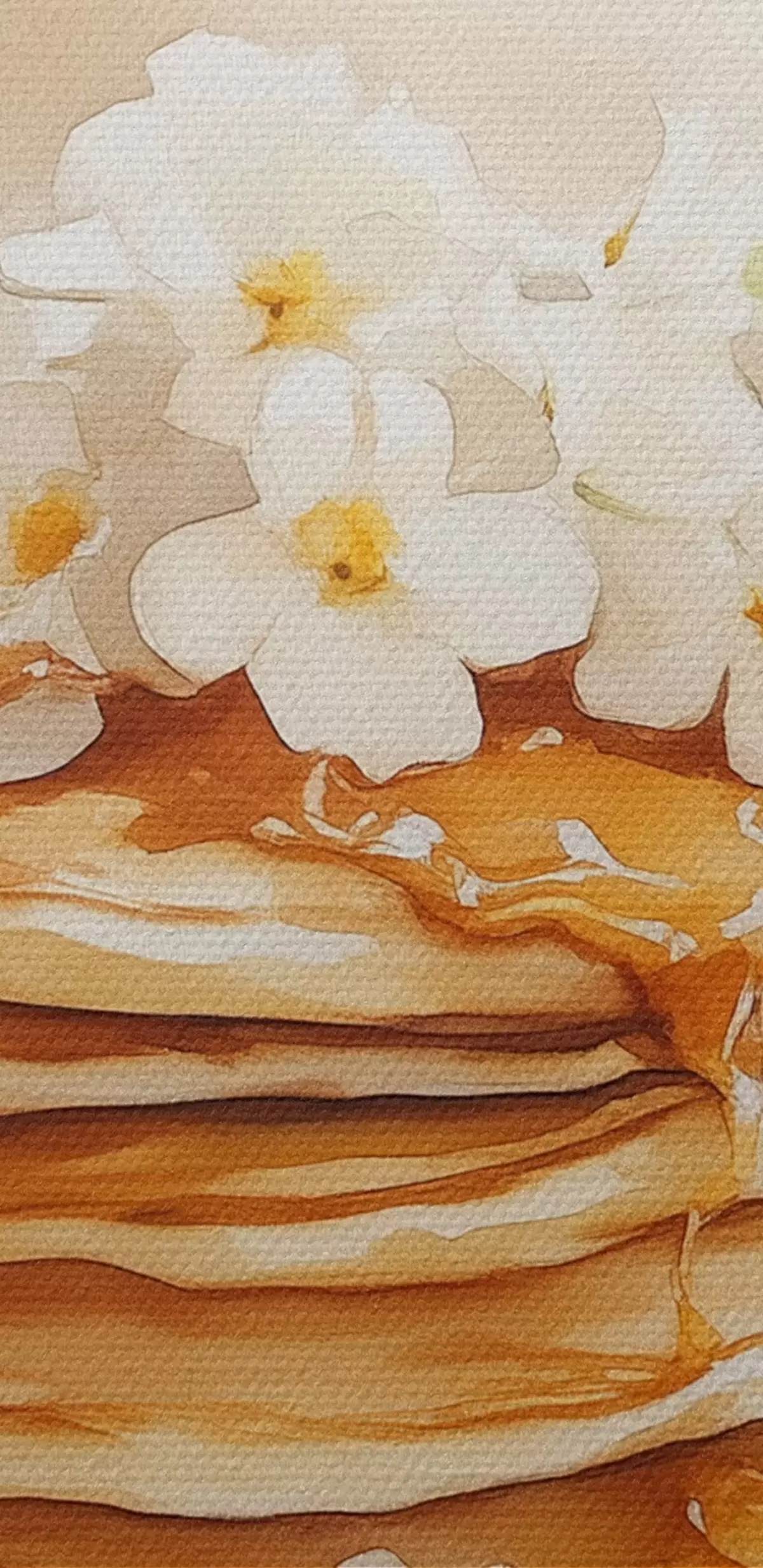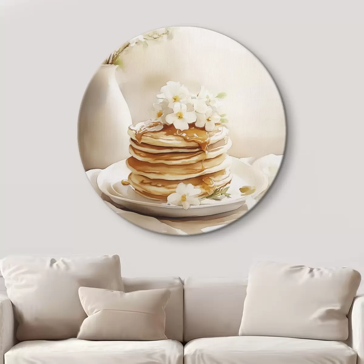 Ronde schilderijen Pannenkoeken met pindakaas, witte bloemen, aquarel stijl tekening Nr r43065