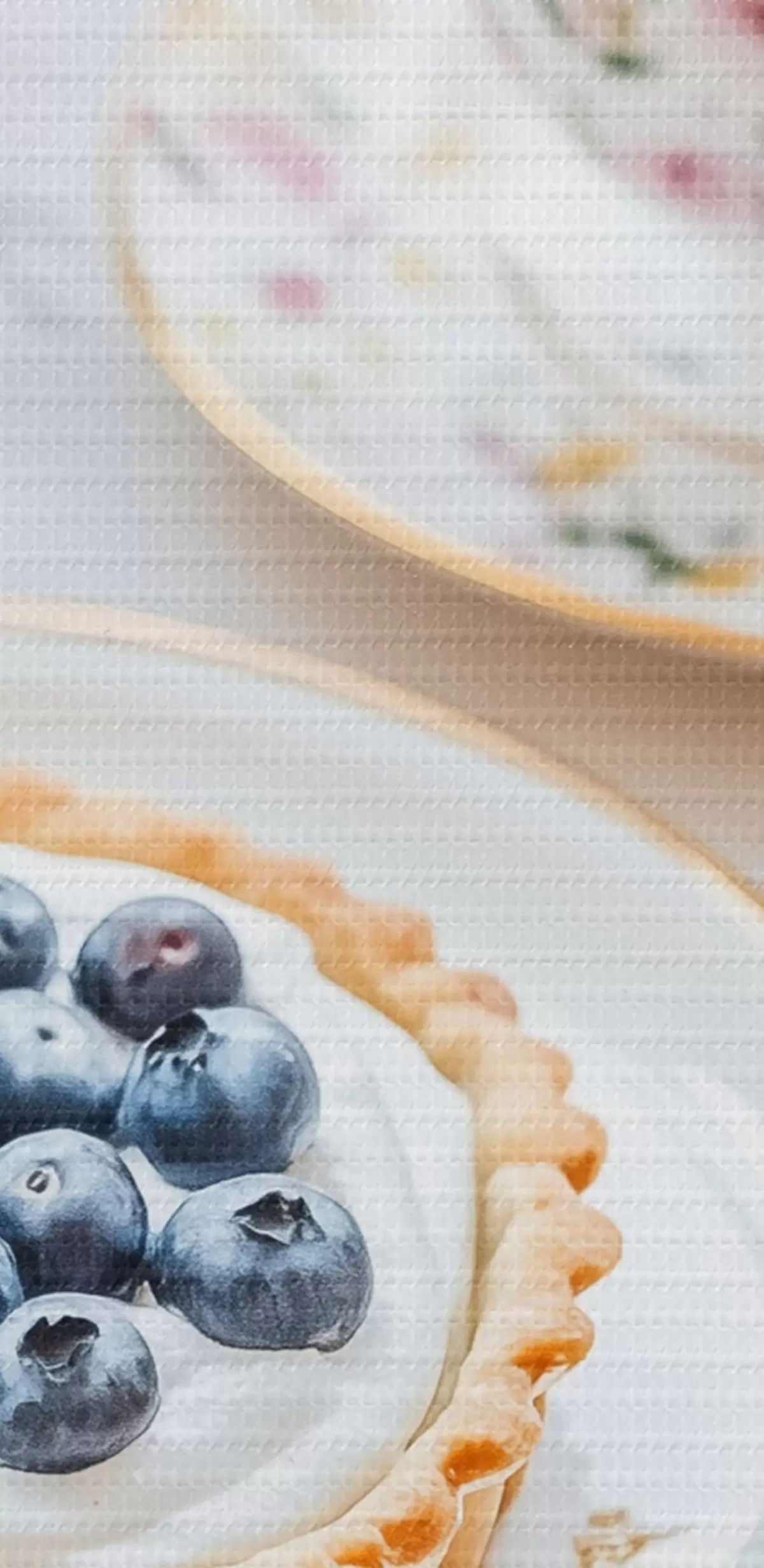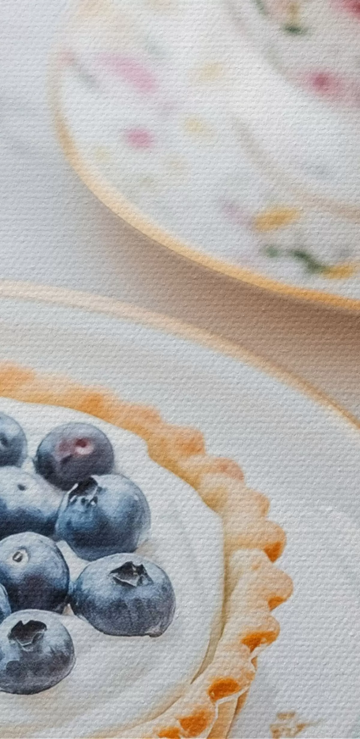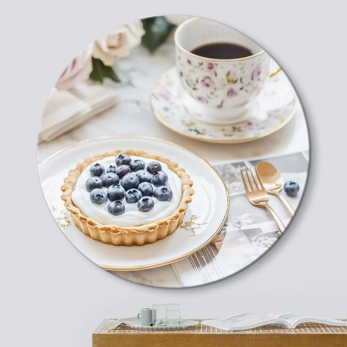 Ronde schilderijen Bosbessen cupcake met kopje thee, boho stijl, roze rozen Nr r43066