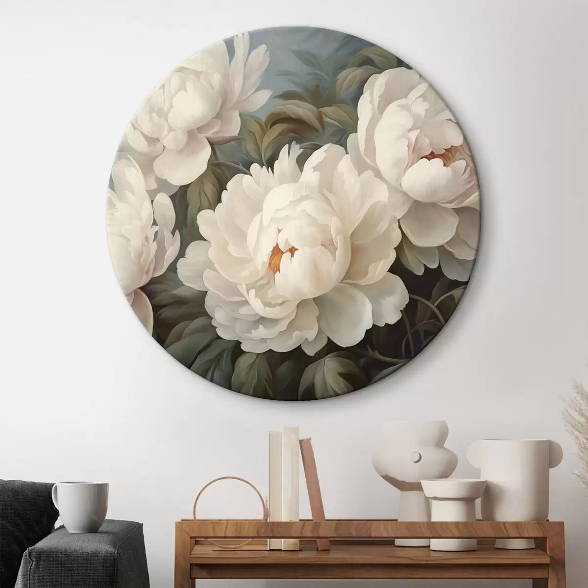 Ronde schilderijen Witte bloemen en bladeren in mist Nr r43091