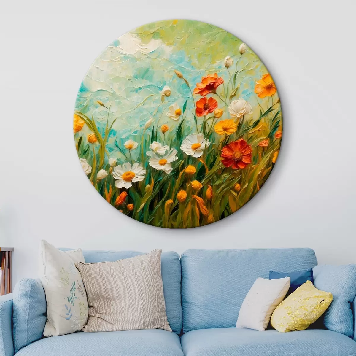 Ronde schilderijen Bloemenveld op abstracte blauwe hemelachtergrond Nr r43100
