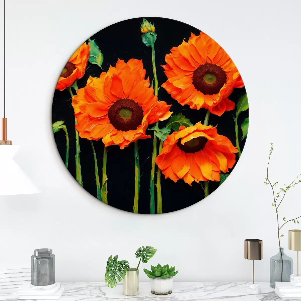Ronde schilderijen Rode zonnebloemen op donkere achtergrond r43103
