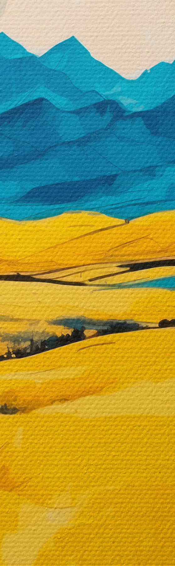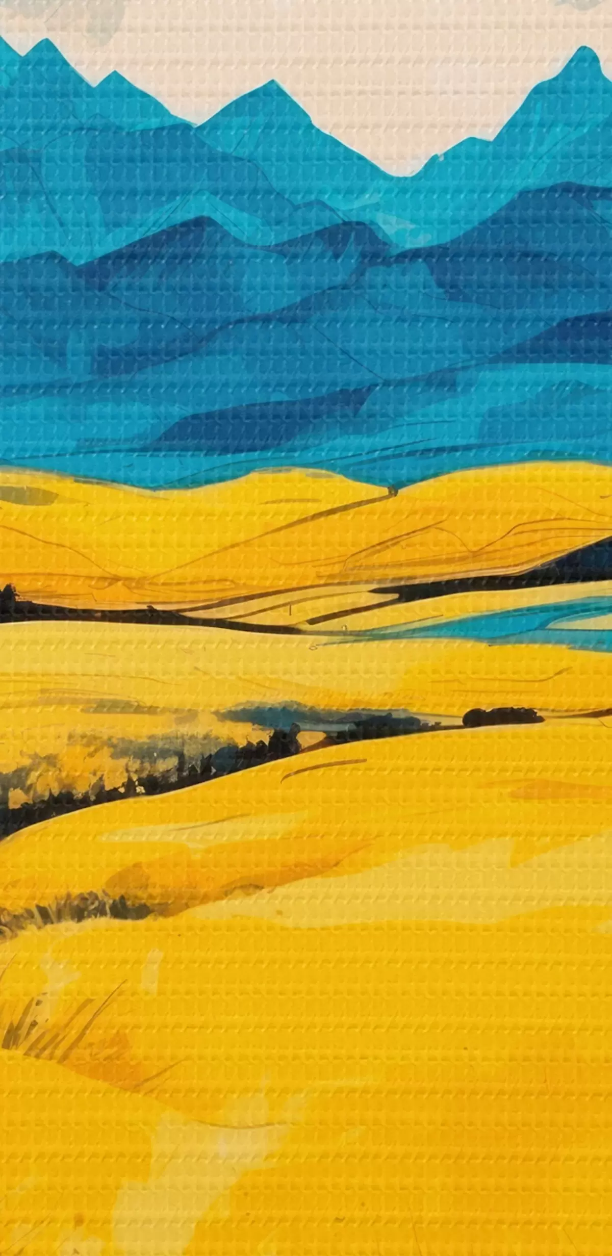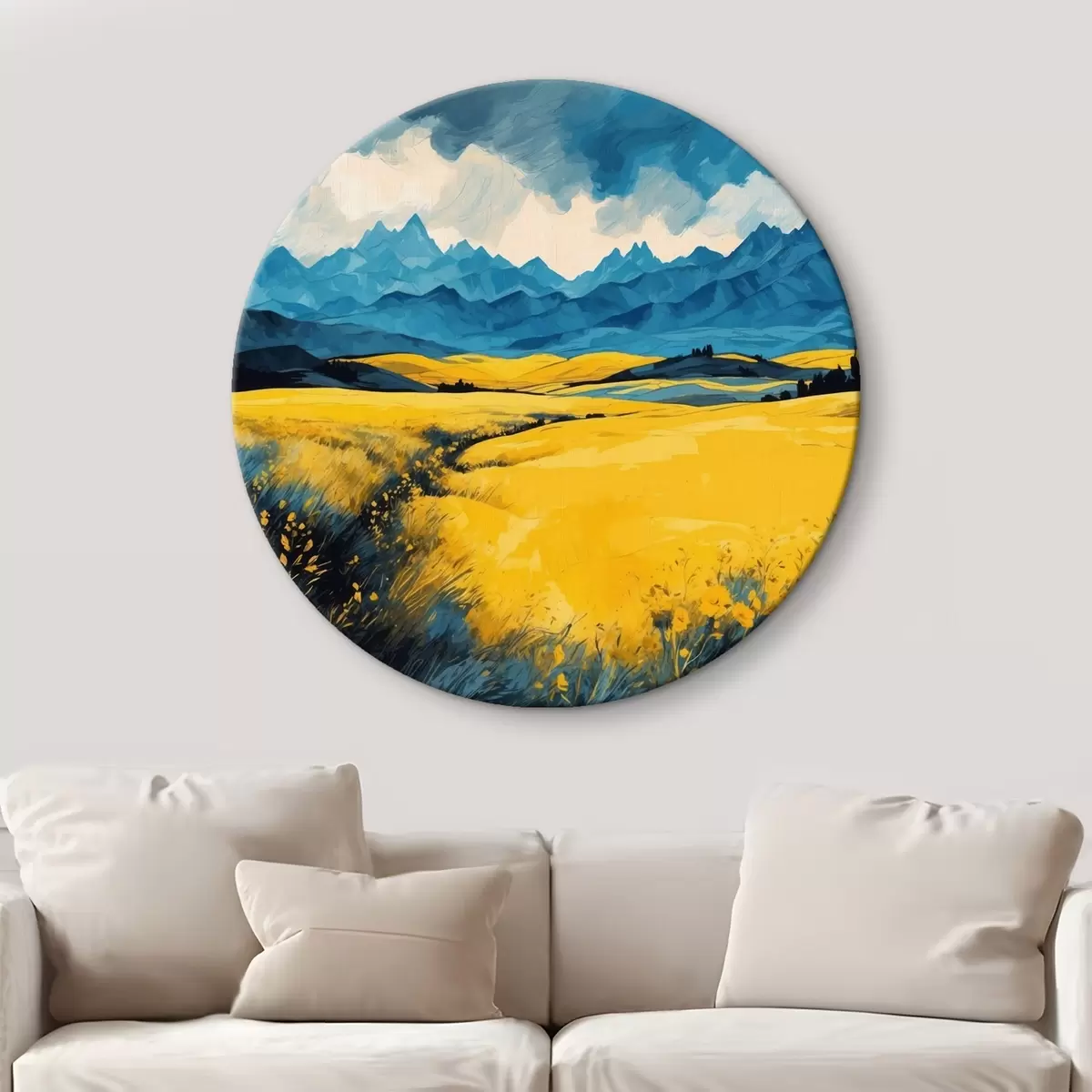 Ronde schilderijen Geel veld op de achtergrond van bergen in aquarel schilderstijl Nr r43117