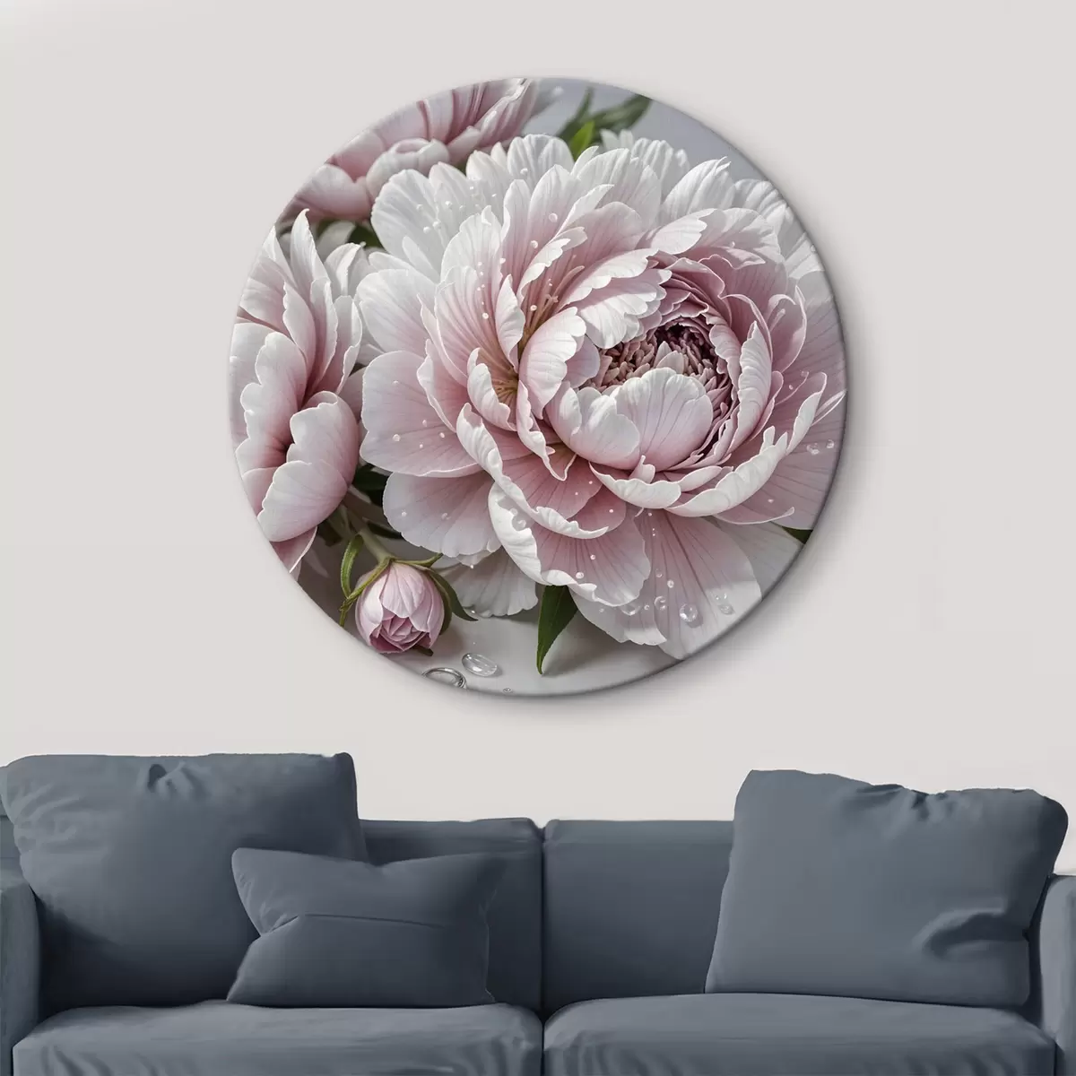 Ronde schilderijen Lichtroze en witte pioenrozen met waterdruppels op de bloemblaadjes, de achtergrond is een wit vlak Nr r43158