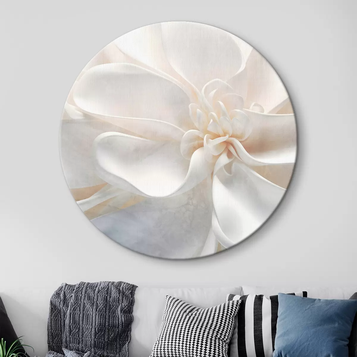 Ronde schilderijen Close-up van een heldere witte abstracte bloem met fijne bloemblaadjes in pastelkleuren r43161