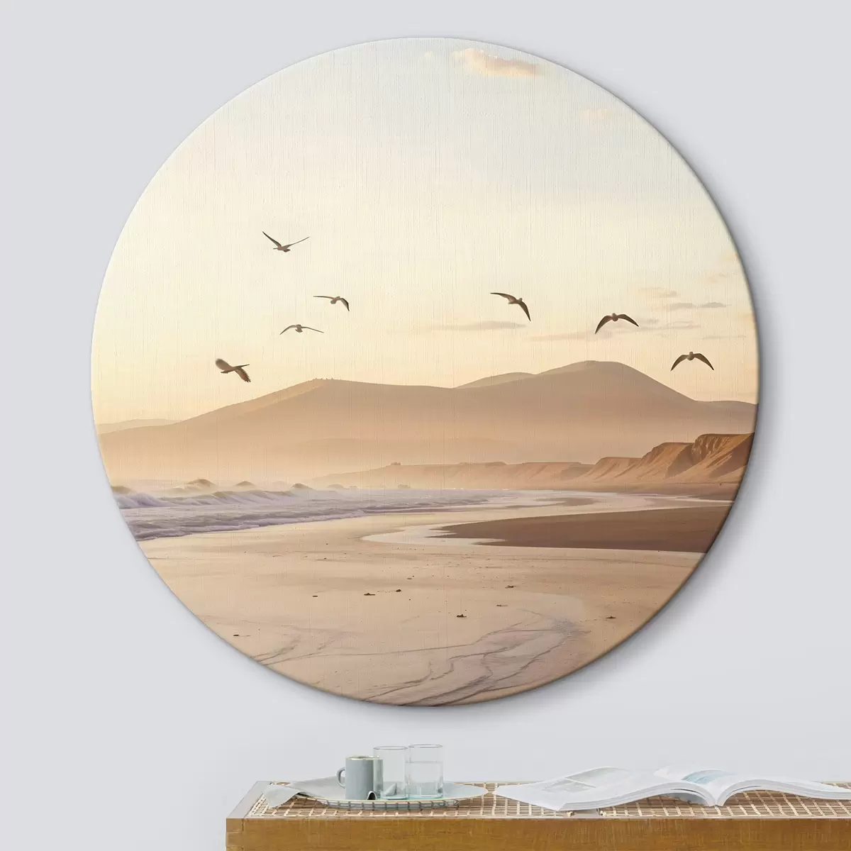 Ronde schilderijen Vogels vliegen over het strand met oceaan, bergen op de achtergrond, warme kleuren, zacht pastel palet Nr r43162