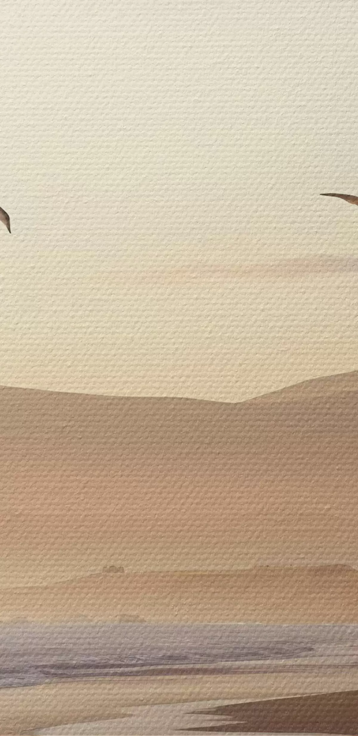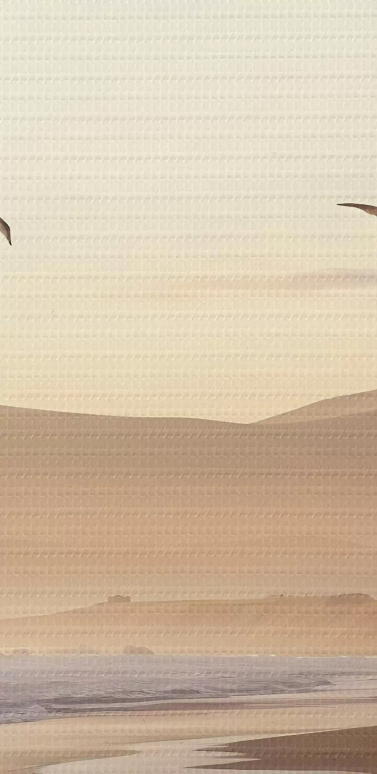 Ronde schilderijen Vogels vliegen over het strand met oceaan, bergen op de achtergrond, warme kleuren, zacht pastel palet r43162