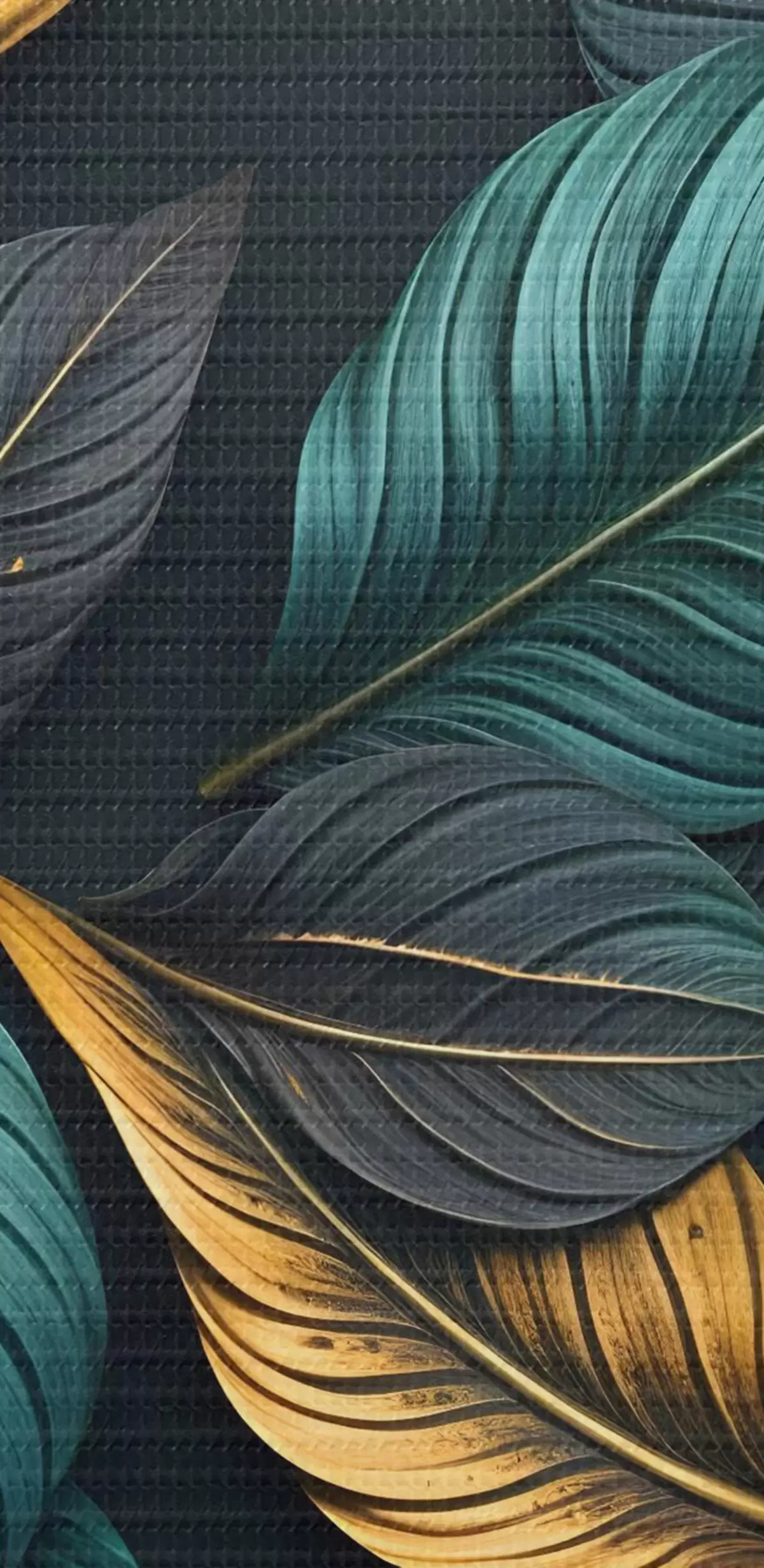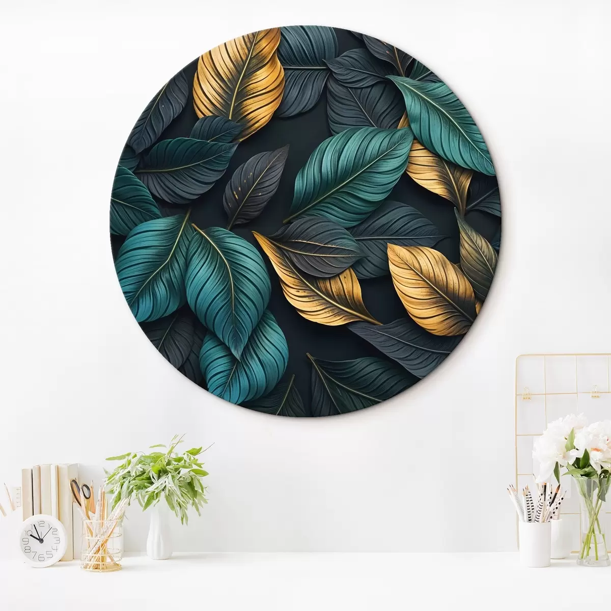 Ronde schilderijen Donkergroen, geel en zwart blad met donkere nerven, op een donkere achtergrond, elegante tropische vibe Nr r43164