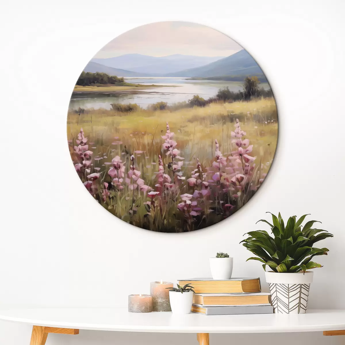 Ronde schilderijen Een landschap met een veld roze bloemen, een meer en bergen op de achtergrond, onder een bewolkte hemel r43165