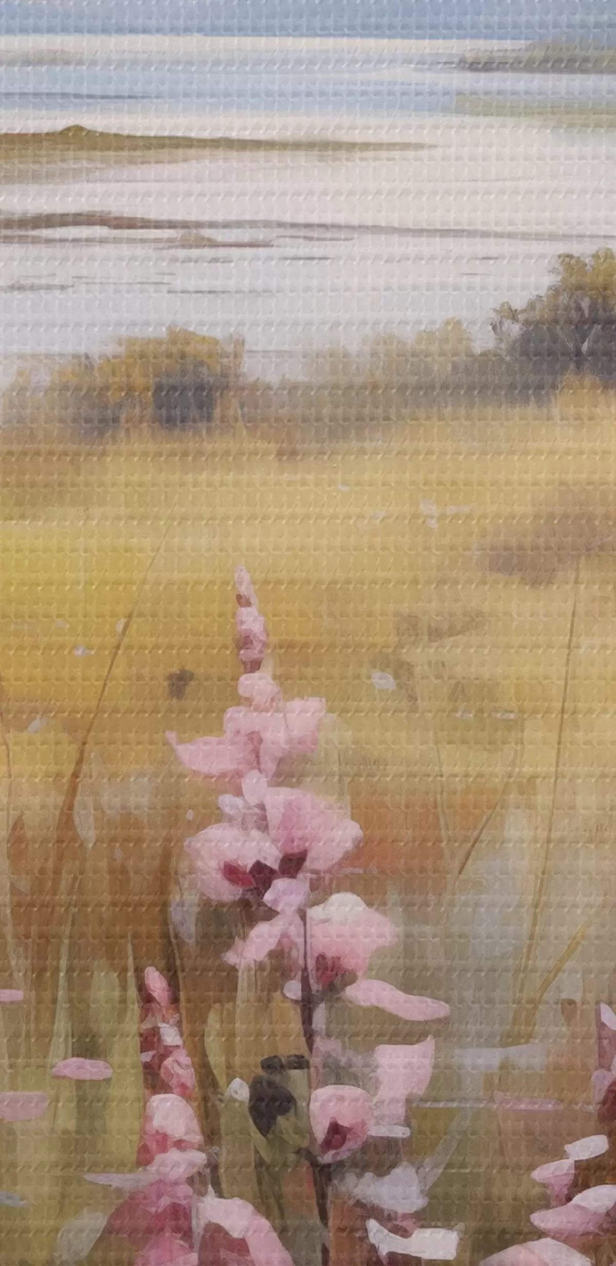 Ronde schilderijen Een landschap met een veld roze bloemen, een meer en bergen op de achtergrond, onder een bewolkte hemel Nr r43165