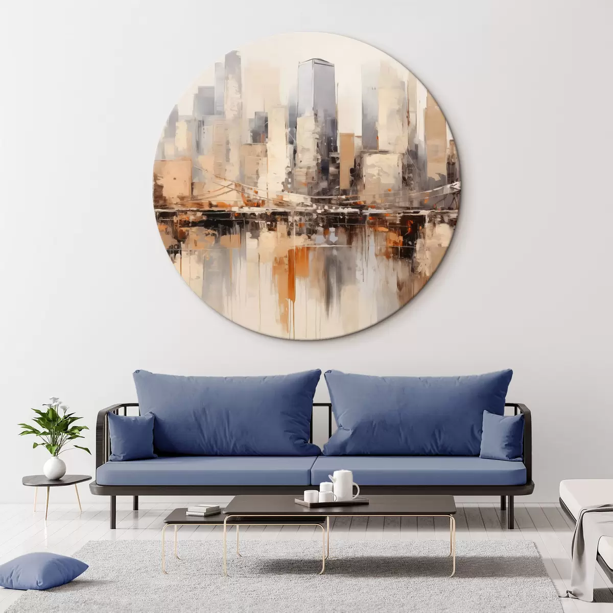 Ronde schilderijen Abstract stadsgezicht met hoge gebouwen in bruine, grijze en witte tinten, weerspiegeld in het water eronder r43168